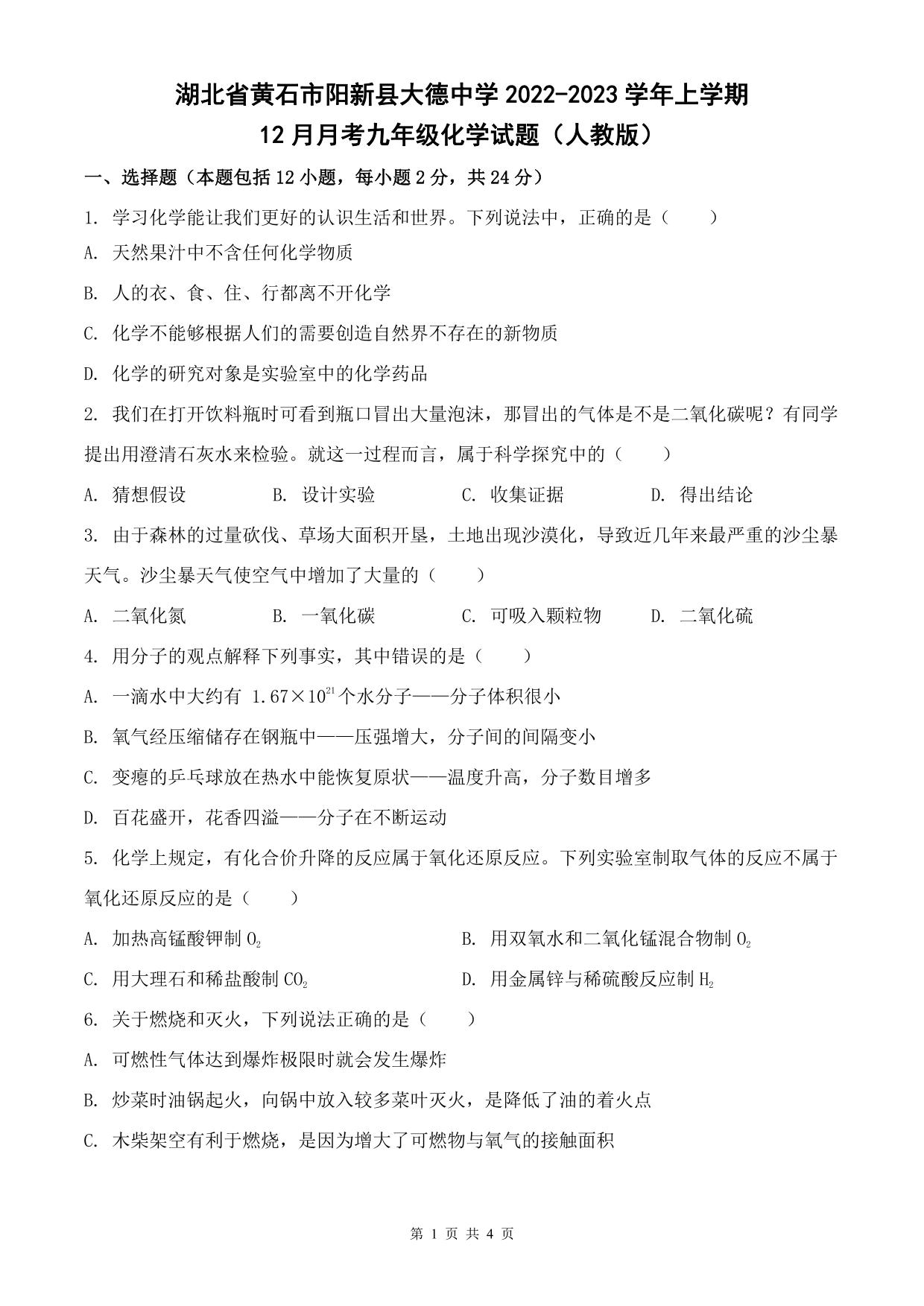 湖北省黄石市阳新县大德中学2022-2023学年上学期12月月考九年级化学试题(人教版)