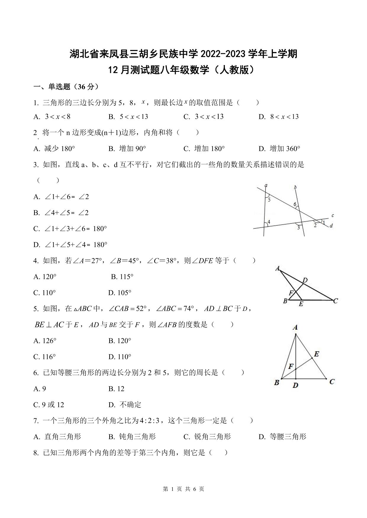 湖北省来凤县三胡乡民族中学2022-2023学年上学期12月测试题八年级数学(人教版)