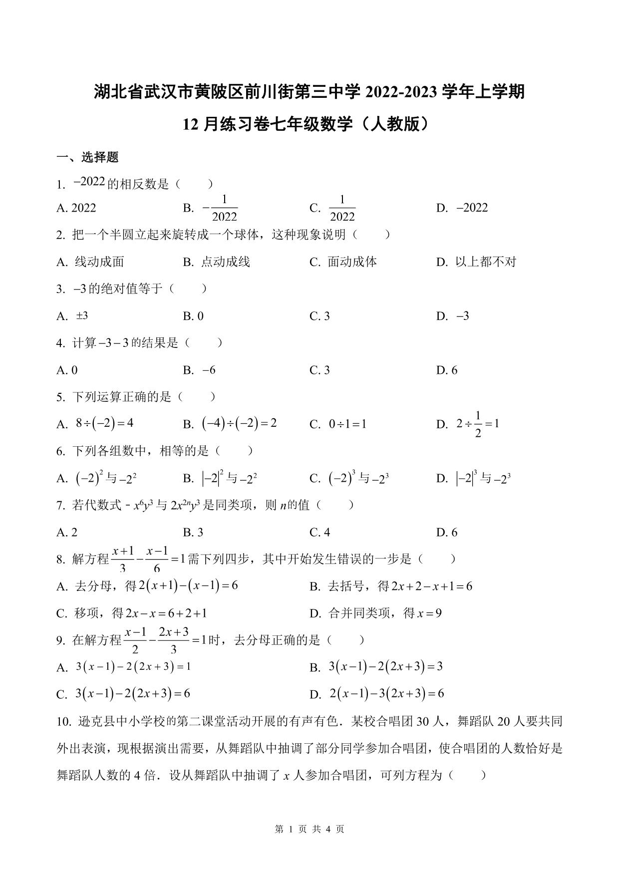 湖北省武汉市黄陂区前川街第三中学2022-2023学年上学期12月练习卷七年级数学(人教版)