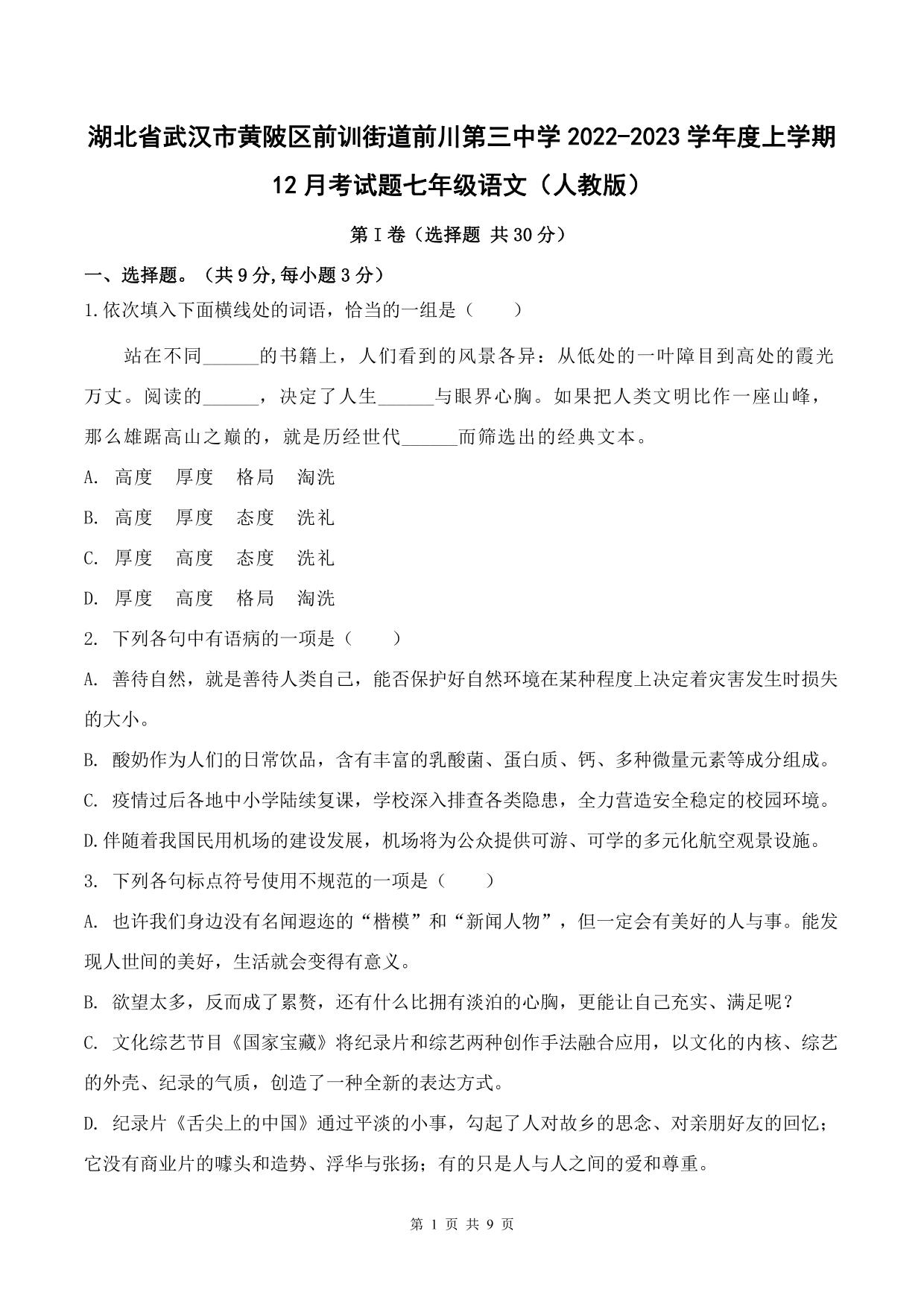 湖北省武汉市黄陂区前训街道前川第三中学2022-2023学年度上学期12月考试题七年级语文(人教版)