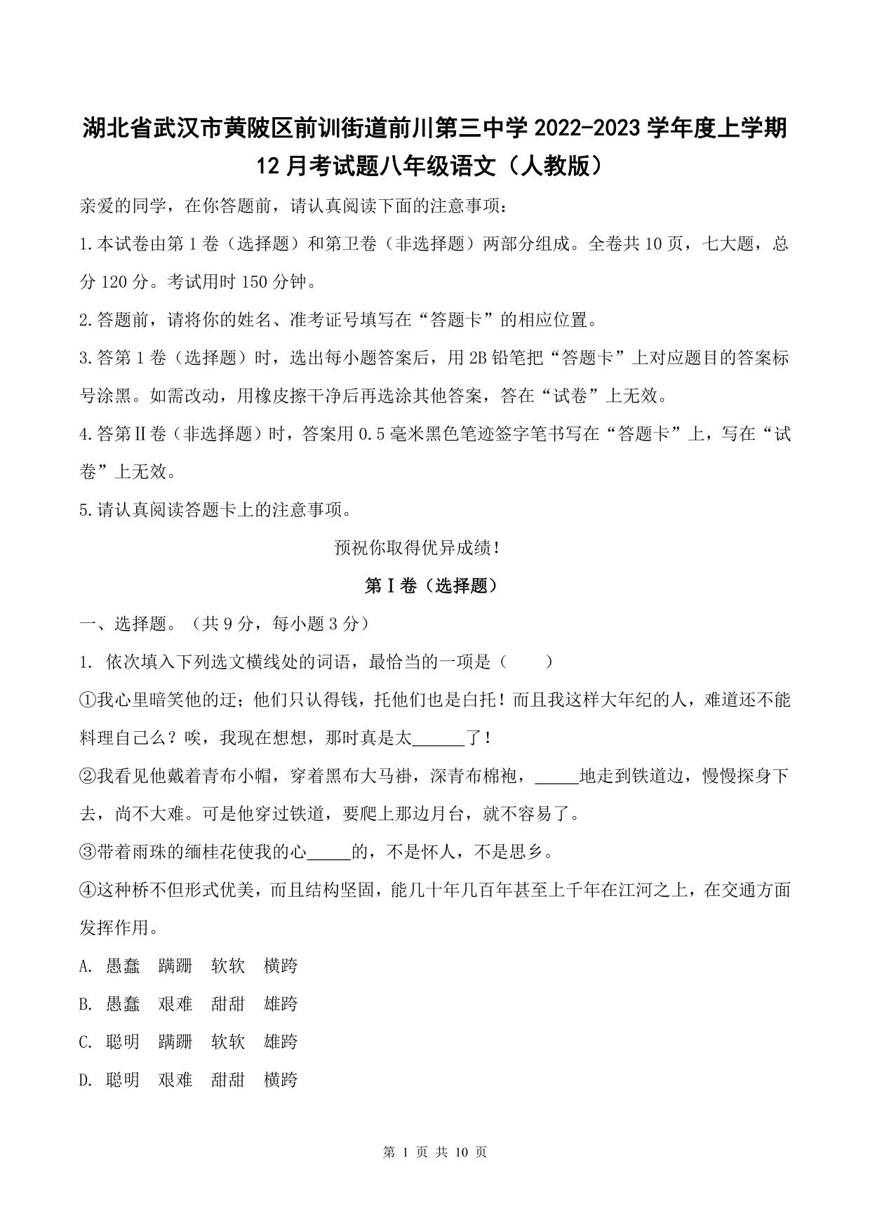 湖北省武汉市黄陂区前训街道前川第三中学2022-2023学年度上学期12月考试题八年级语文(人教版)