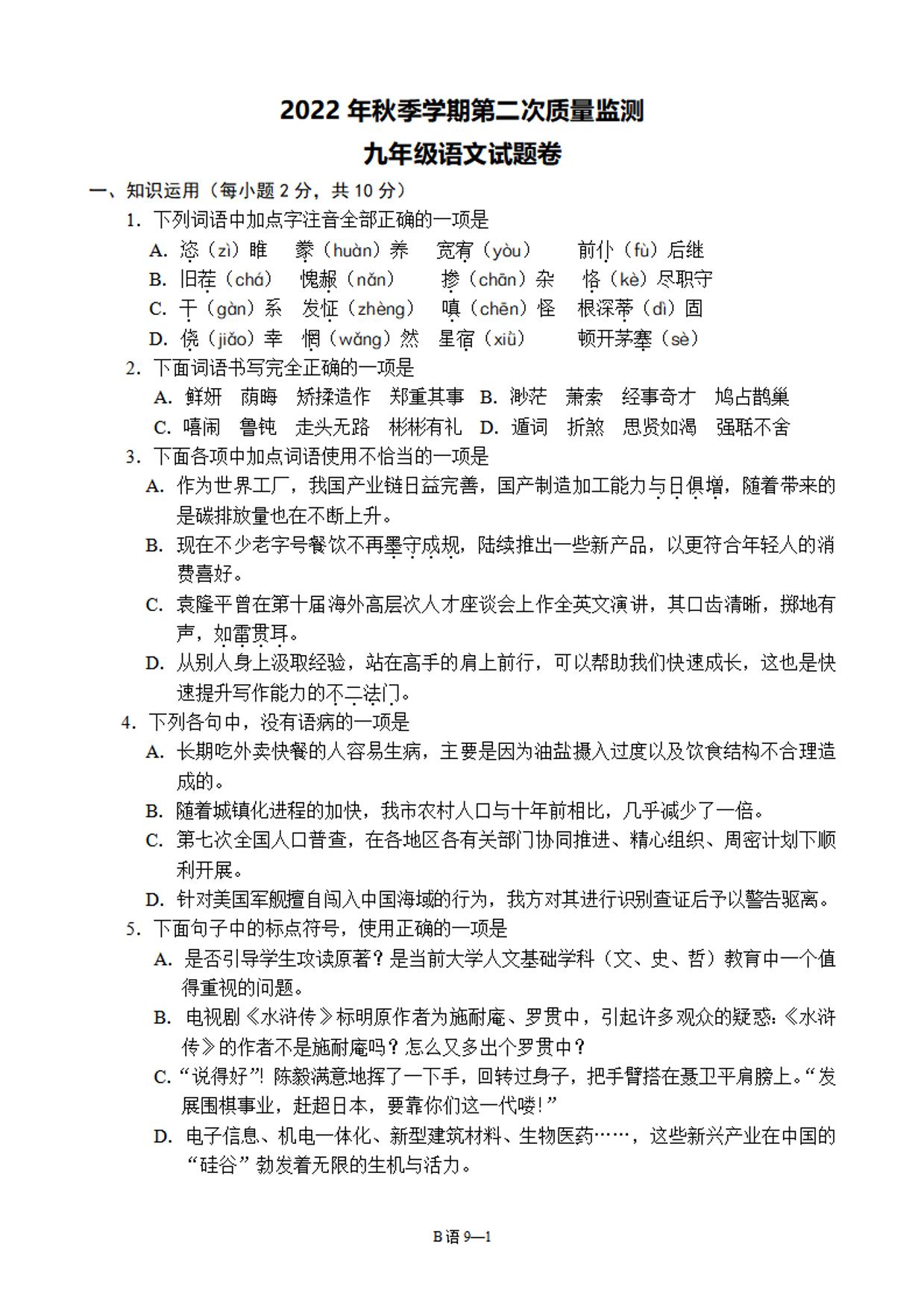 九年级语文人教版上册月考卷