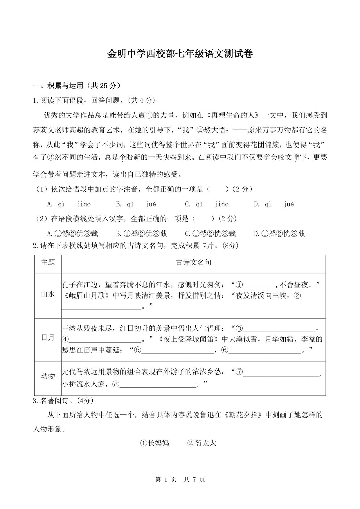 河南省开封市金明中学西校部2022-2023学年度第一学期11月月考测试卷七年级语文(人教版)