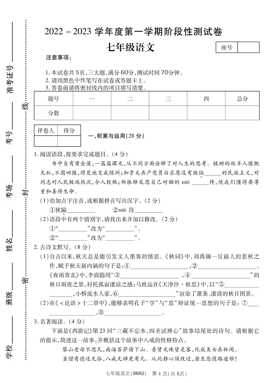 七年级语文人教版上册月考卷