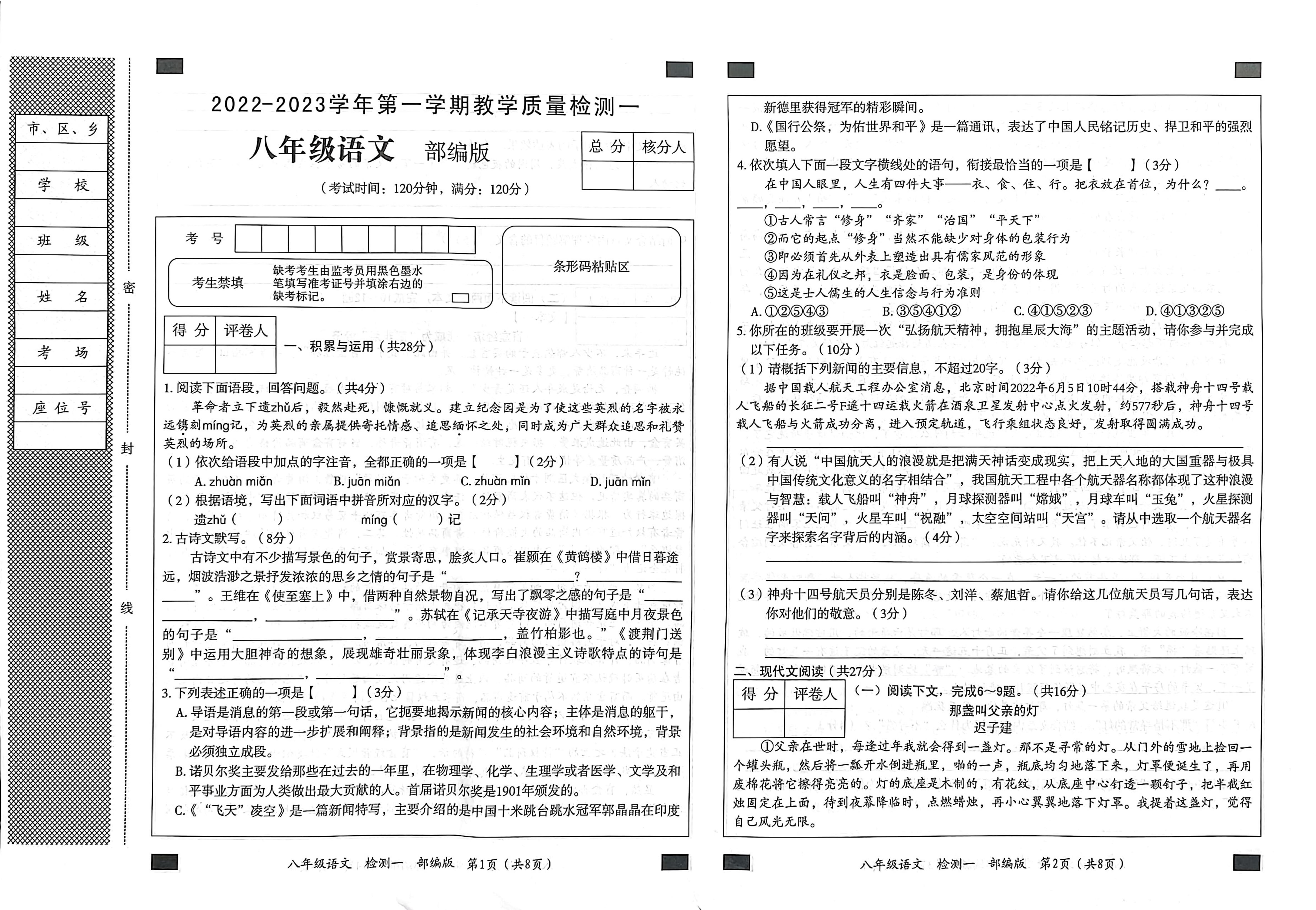 河南省周口市淮阳区冯塘乡第三中学2022-2023学年第一学期教学质量检测一11月月考八年级语文(人教版)