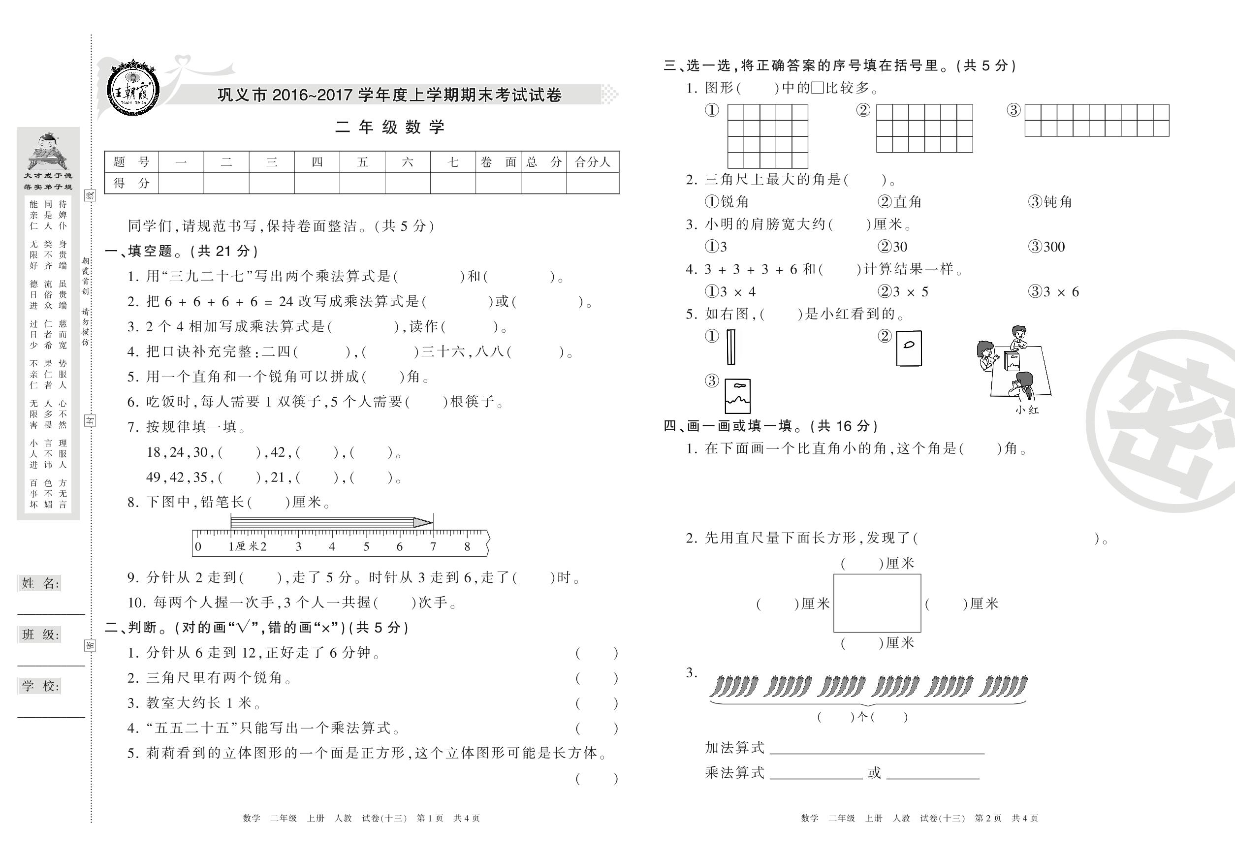 2016-2017学年第一学期巩义市二年级数学试卷(人教版)【13】