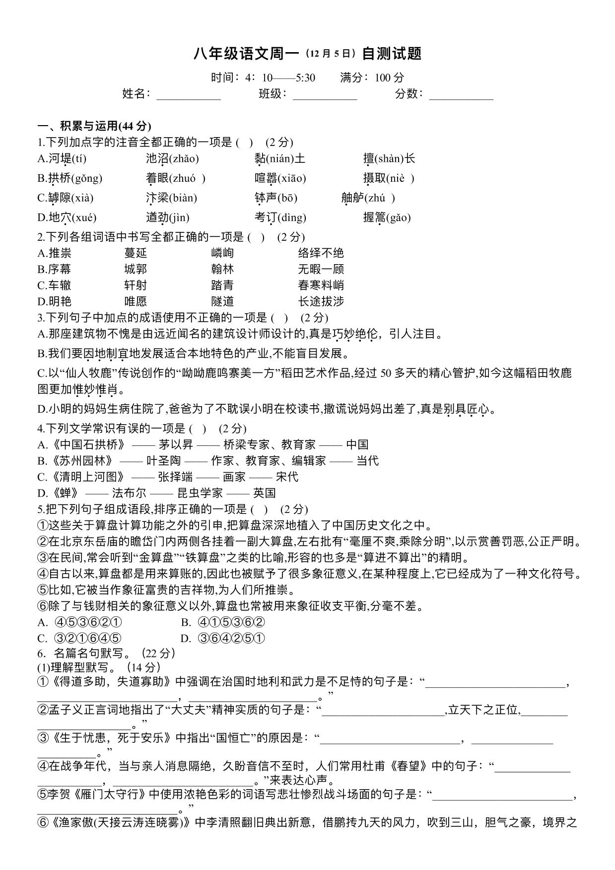 河南省开封市金明中学2022-2023学年第一学期12月自测试题八年级语文(人教版)