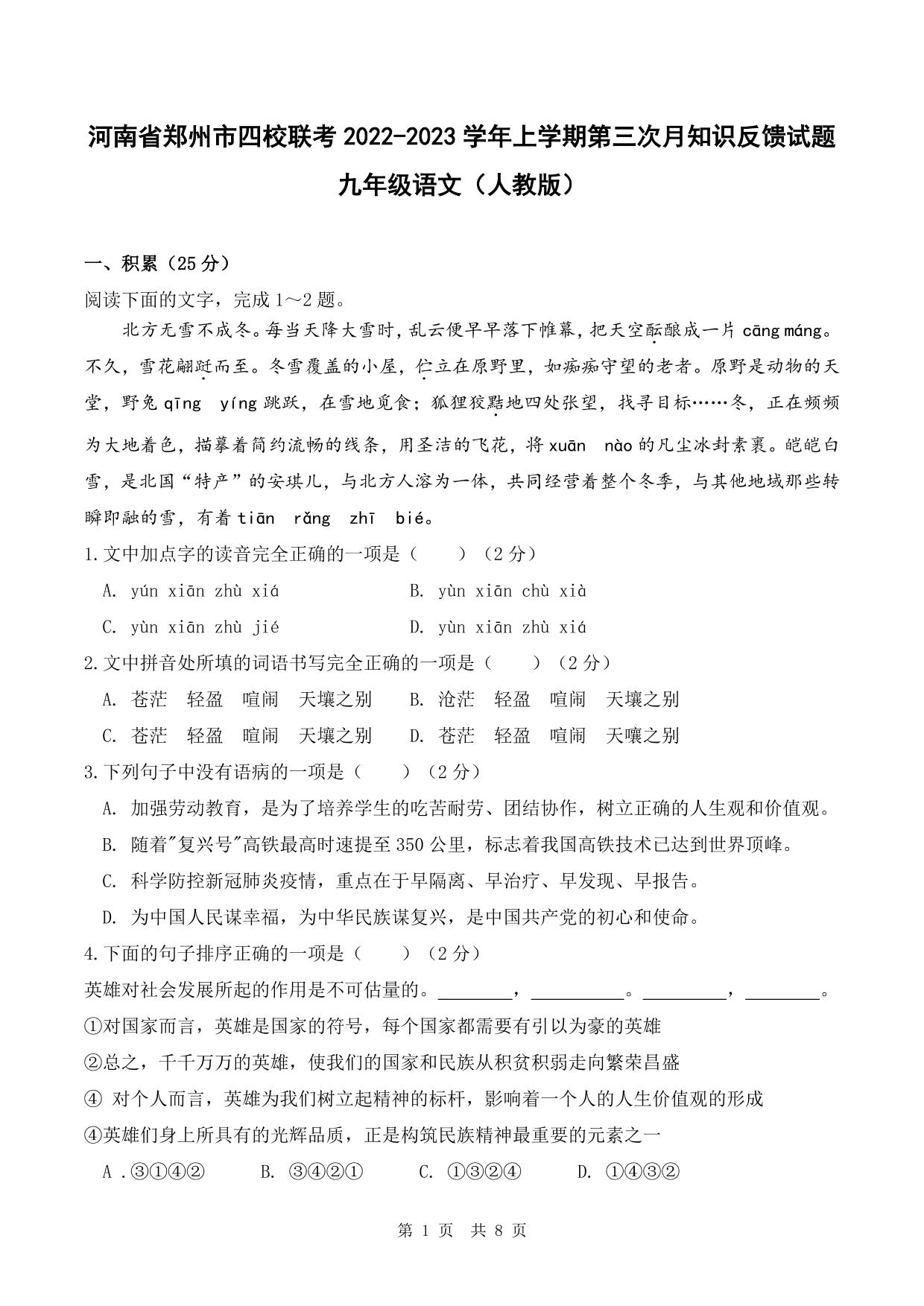 河南省郑州市四校联考2022-2023学年上学期第三次月知识反馈试题九年级语文(人教版)