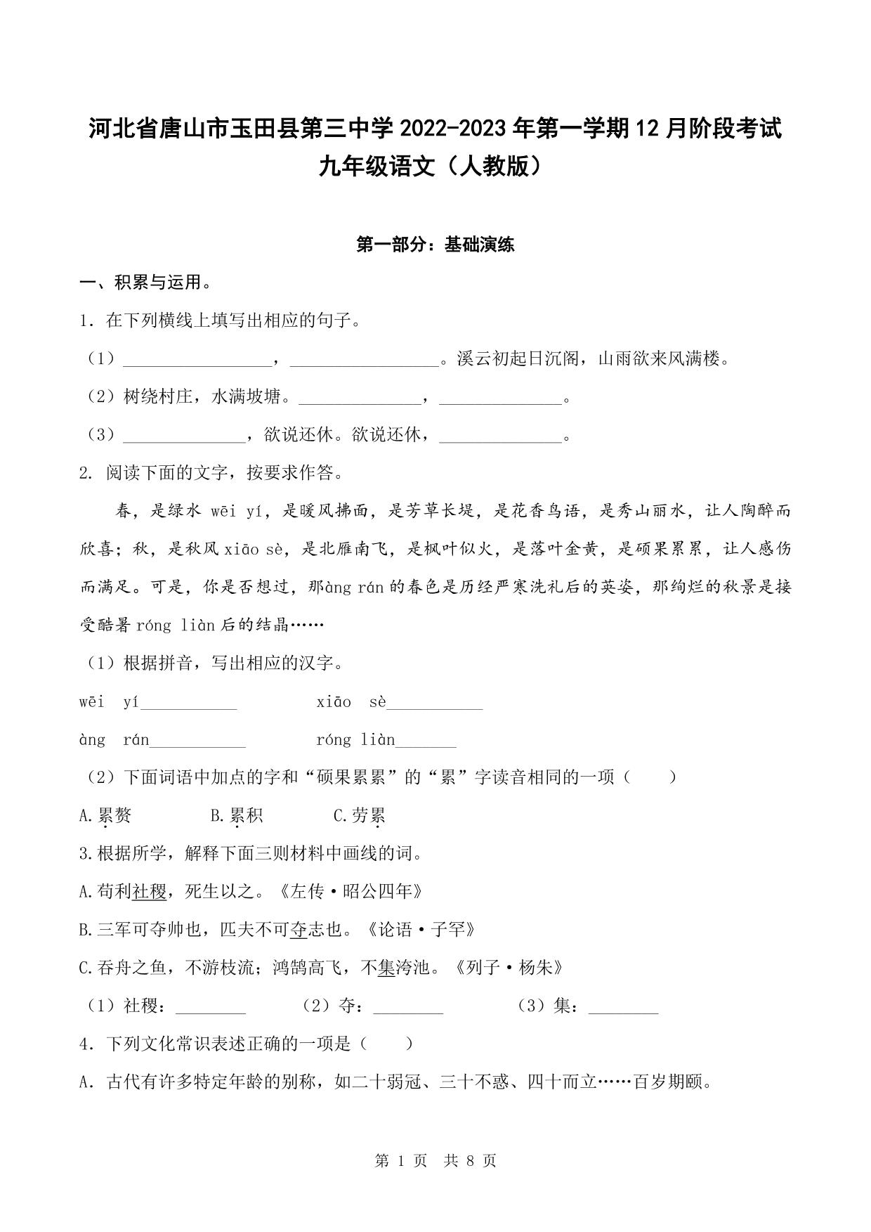 河北省唐山市玉田县第三中学2022-2023学年第一学期12月阶段考试九年级语文(人教版)