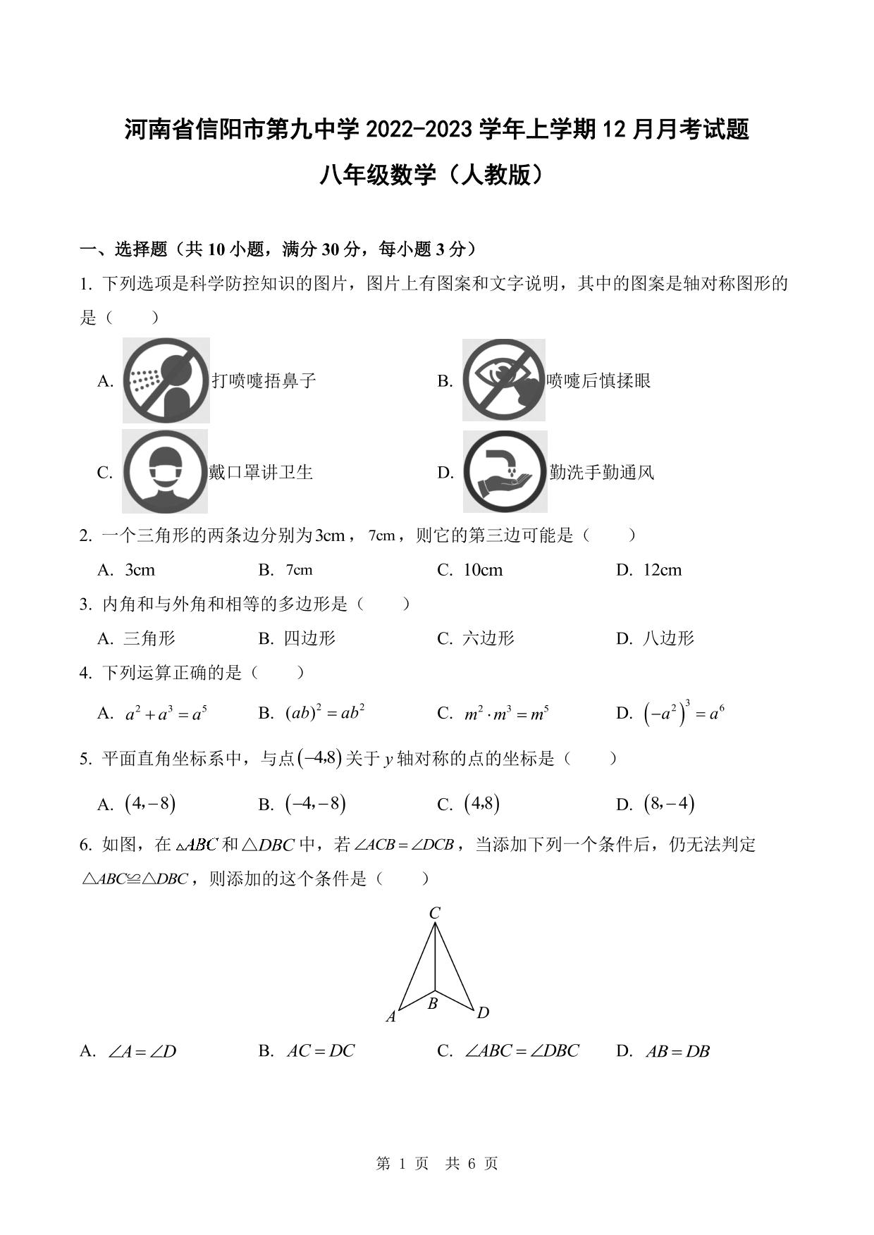 河南省信阳市第九中学2022-2023学年上学期12月月考试题八年级数学(人教版)
