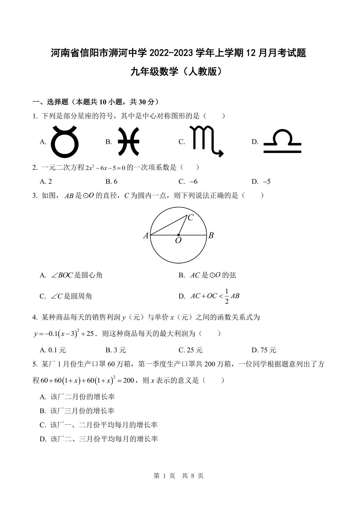 河南省信阳市浉河中学2022-2023学年上学期12月月考试题九年级数学(人教版)