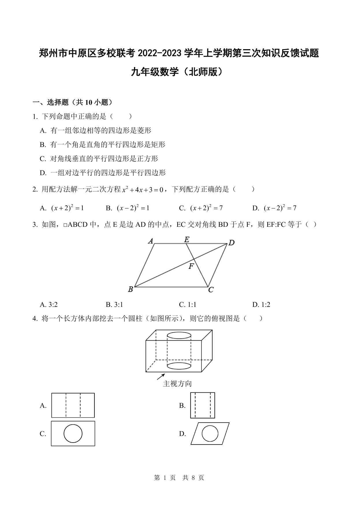 河南省郑州市中原区多校联考2022-2023学年上学期第三次知识反馈试题九年级数学(北师版)
