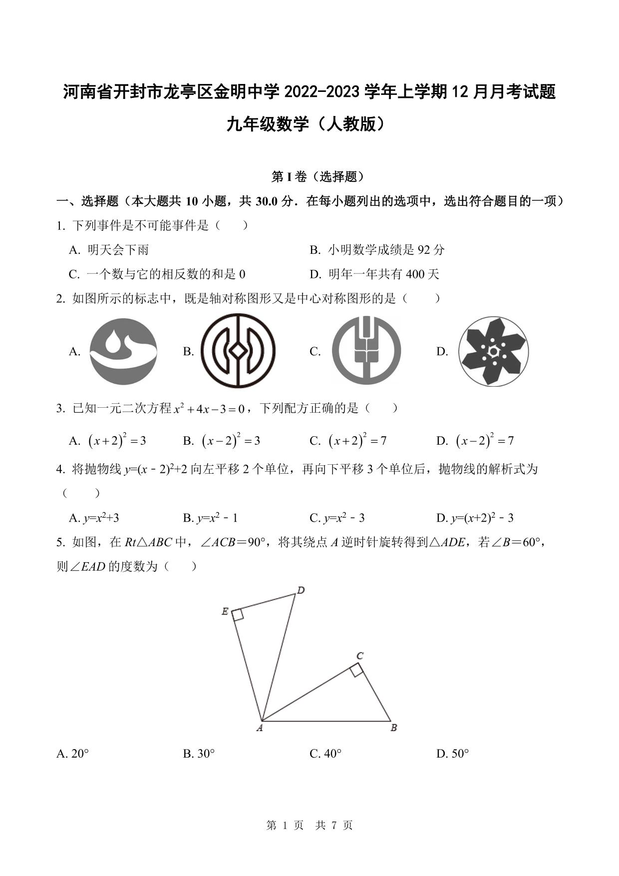 河南省开封市龙亭区金明中学2022-2023学年上学期12月月考试题九年级数学(人教版)