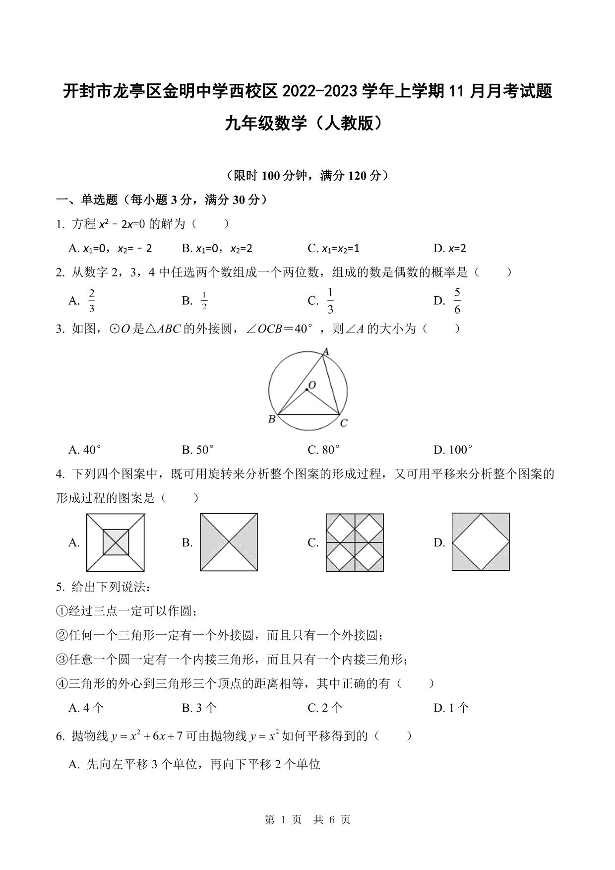 河南省开封市龙亭区金明中学西校区2022-2023学年上学期限时训练11月月考九年级数学(人教版)