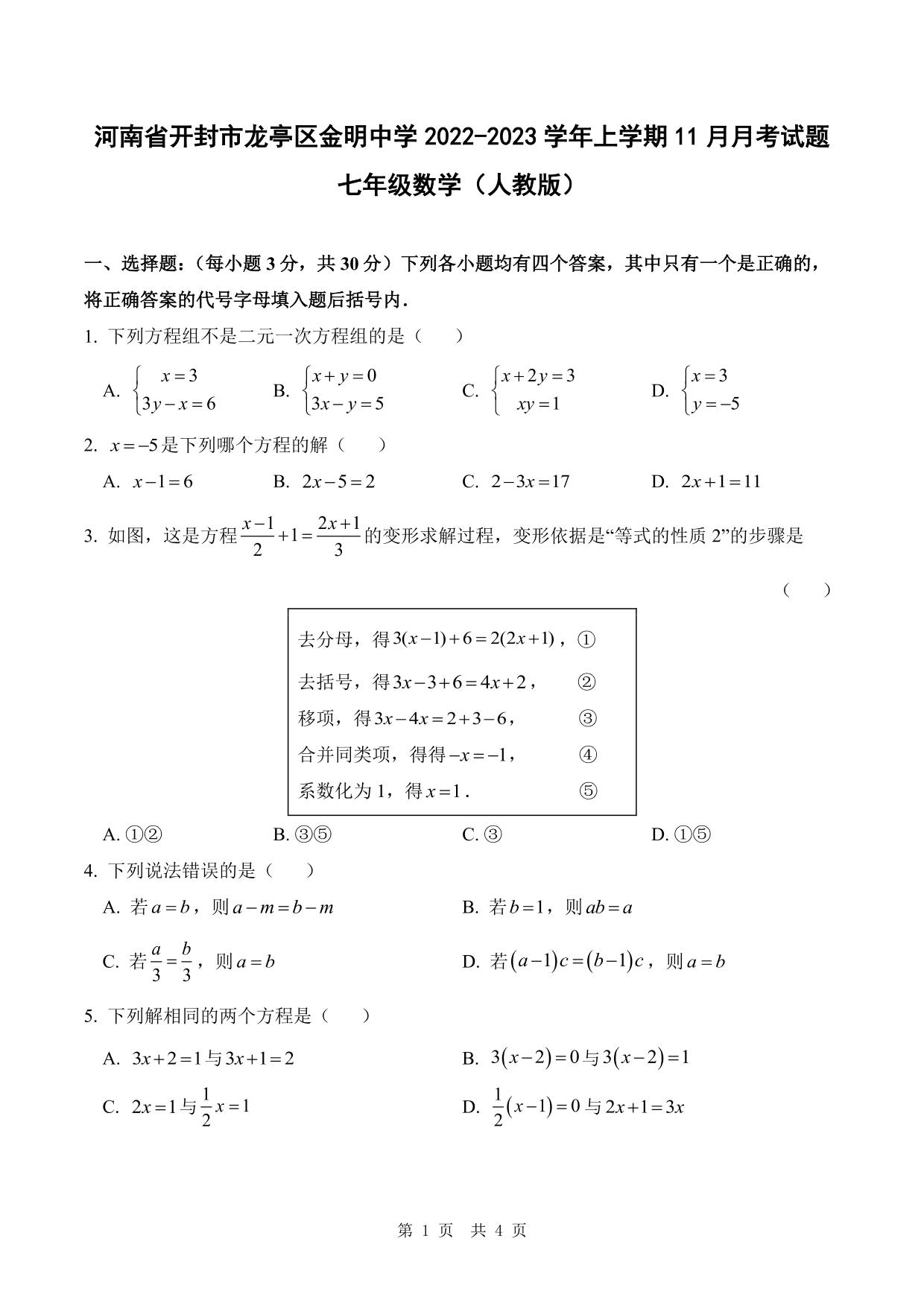 河南省开封市龙亭区金明中学2022-2023学年上学期11月月考试题七年级数学(人教版)