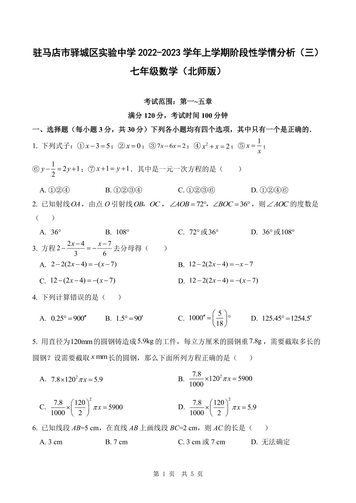 河南省驻马店市驿城区实验中学2022-2023学年上学期阶段性学情分析(三)12月月考七年级数学(北师版)