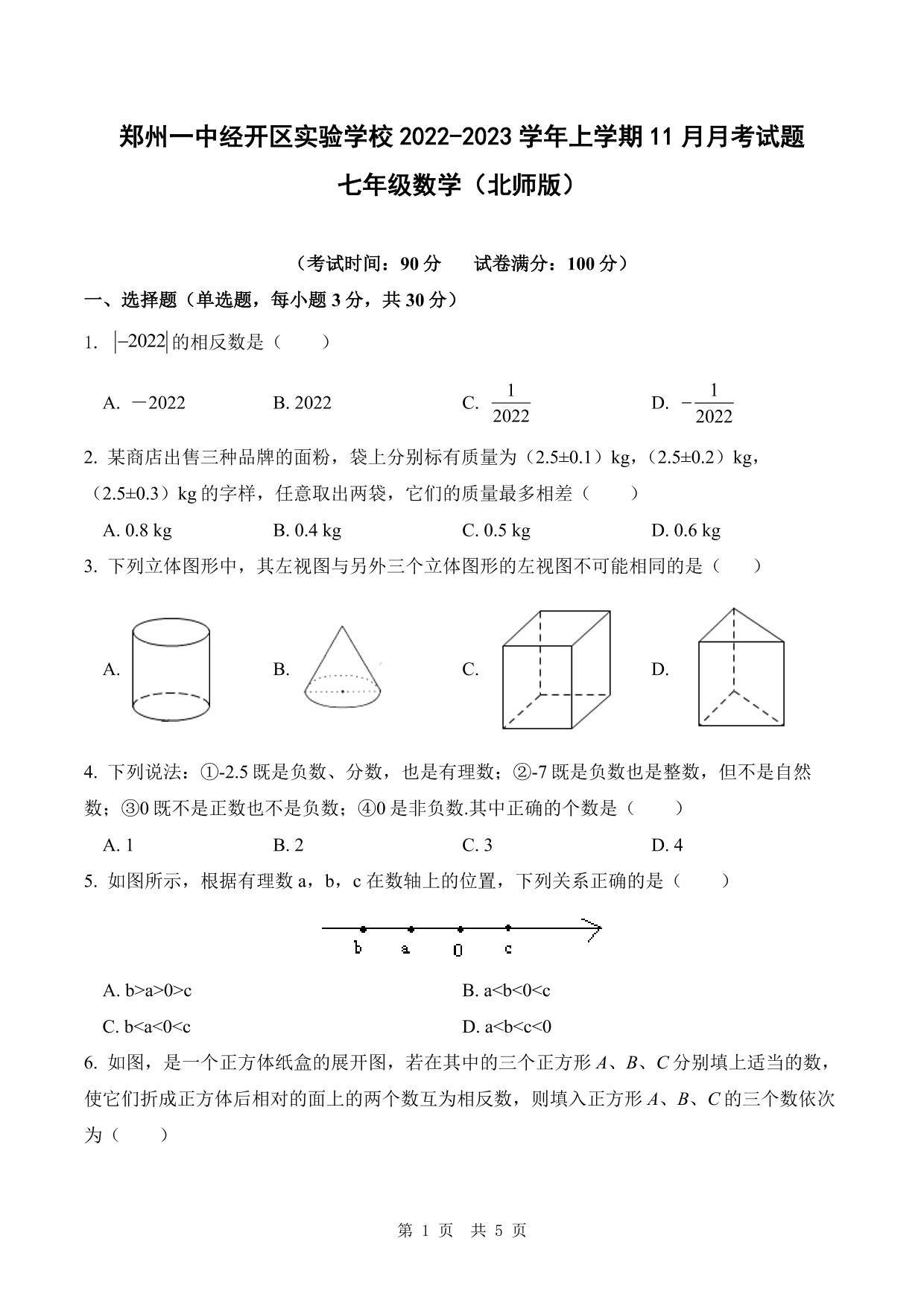 河南省郑州市郑州一中经开区实验学校2022-2023学年上学期11月月考试题七年级数学(北师版)