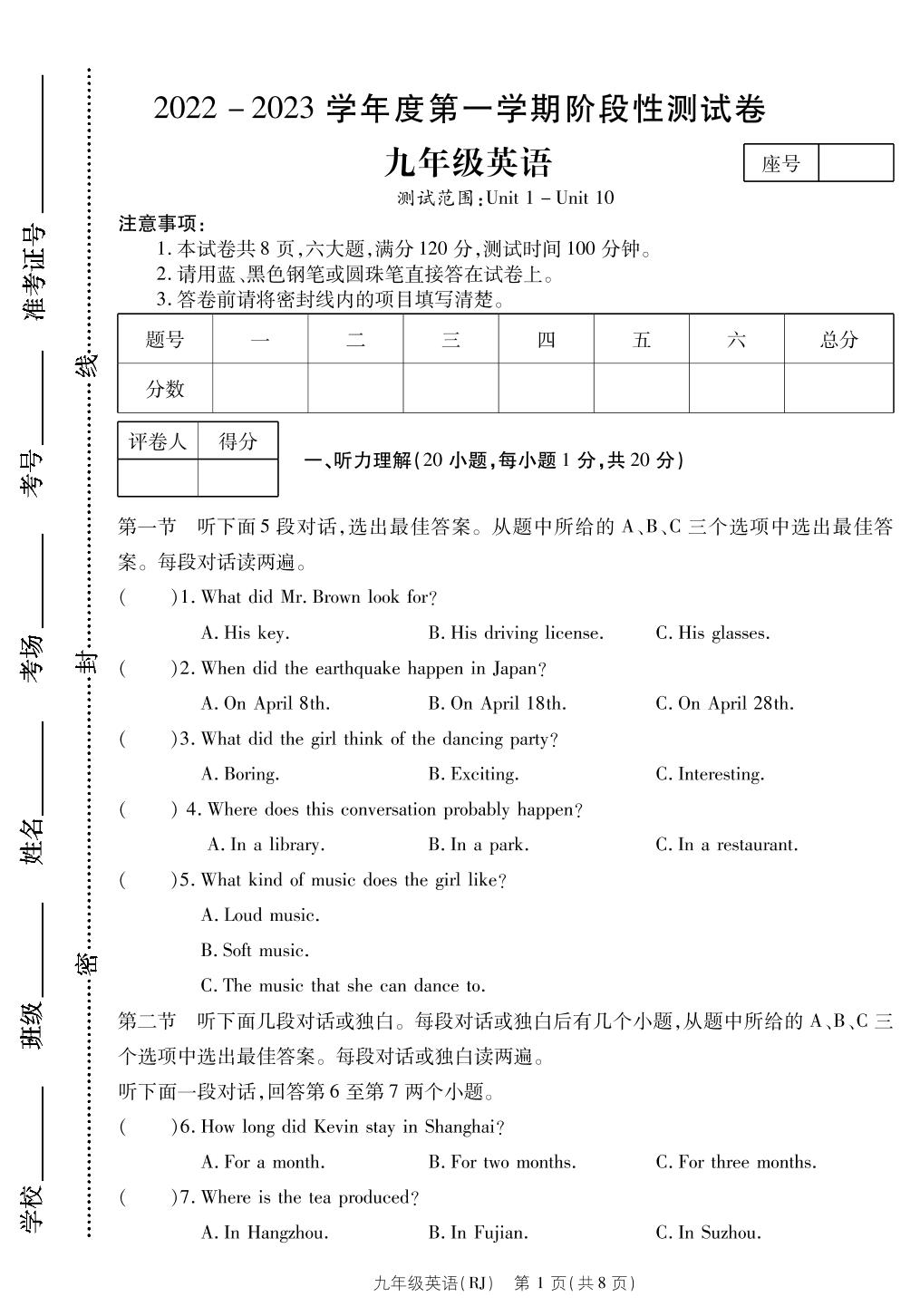 九年级英语人教版上册月考卷
