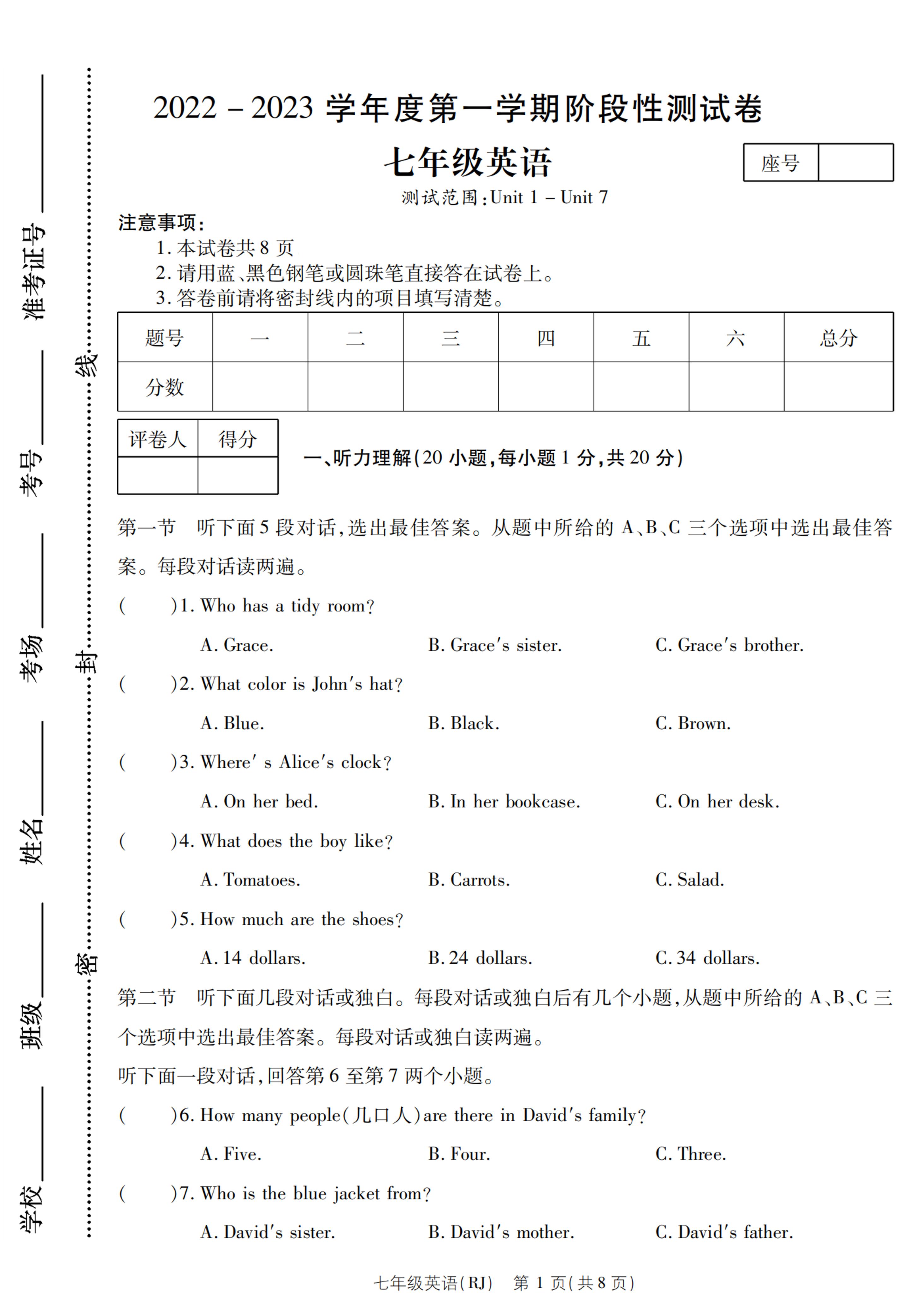 河南省开封市金明中学2022-2023学年度第一学期阶段性测试卷12月月考七年级英语(人教版)【无听力音频】