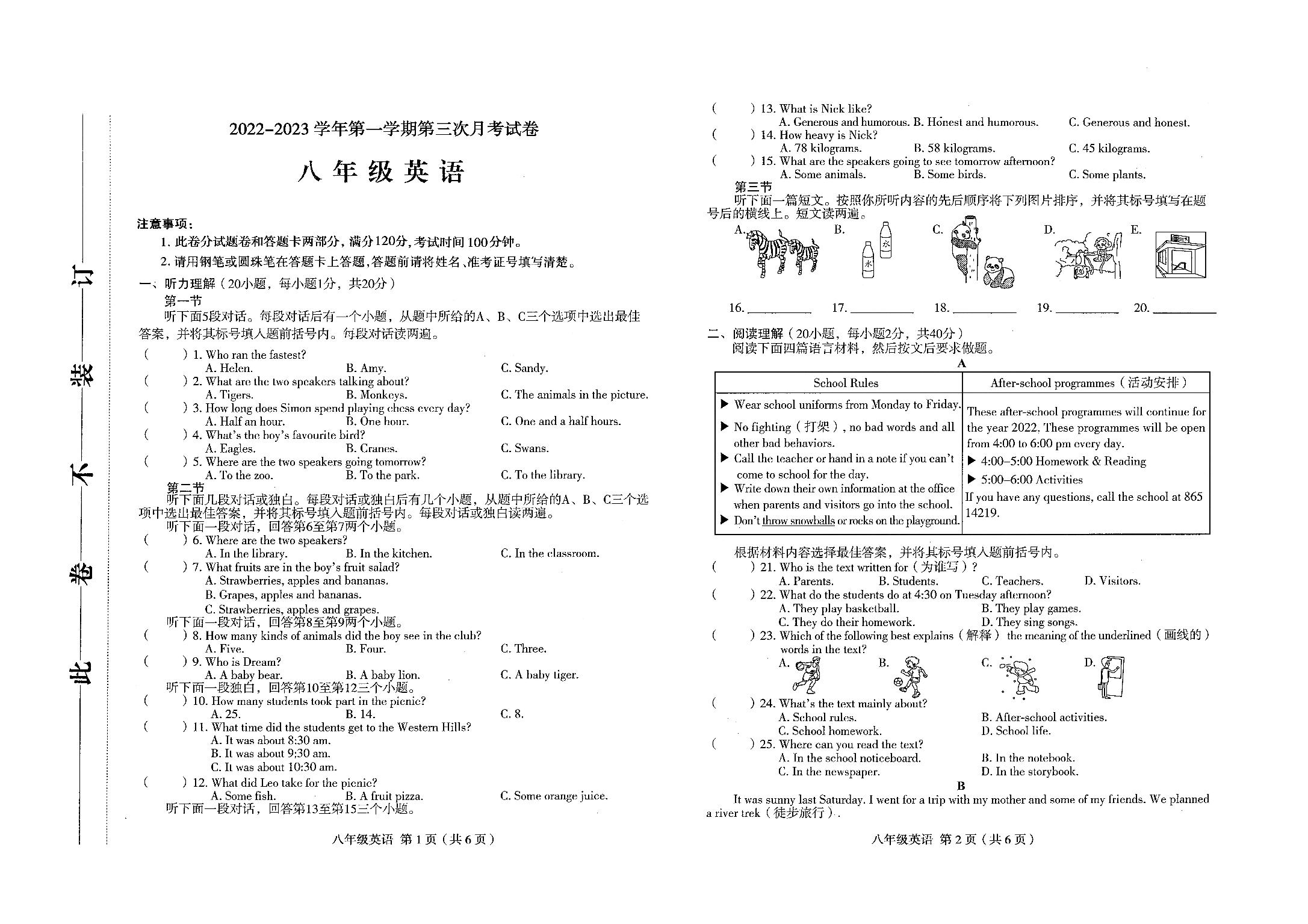 河南省周口市郸城高新技术产业开发区学校2022-2023学年第一学期第三次月考试卷八年级英语(译林牛津版)【无听力音频】