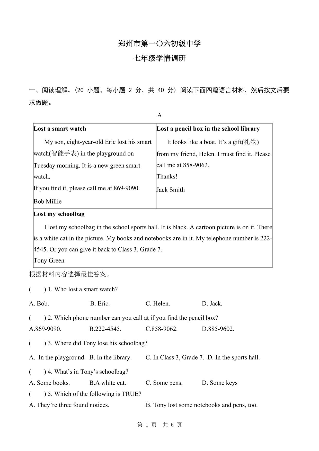 河南省郑州市第106初级中学2022-2023上学期学情调研11月月考试卷七年级英语(人教版)【无听力音频】