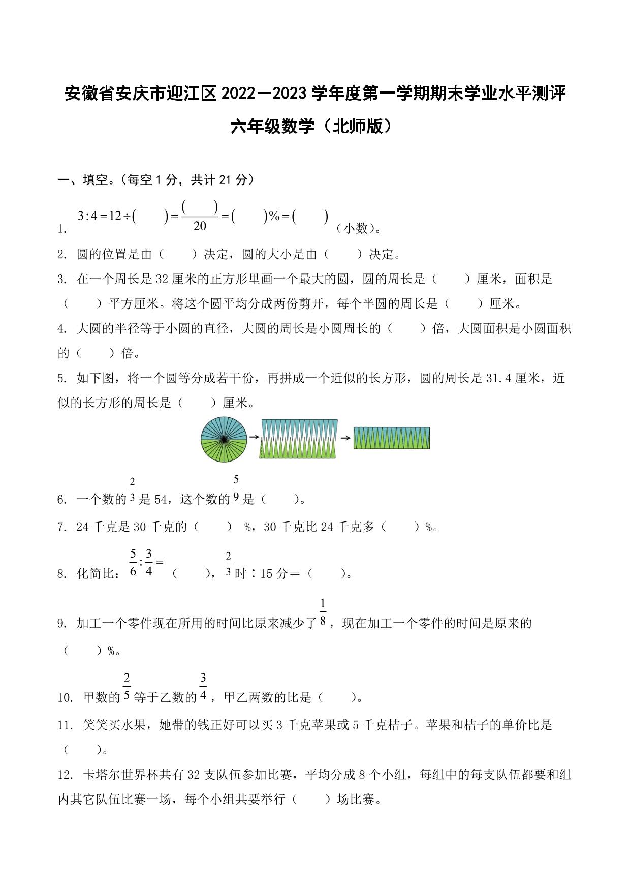 安徽省安庆市迎江区2022-2023学年度第一学期期末学业水平测评六年级数学(北师版)