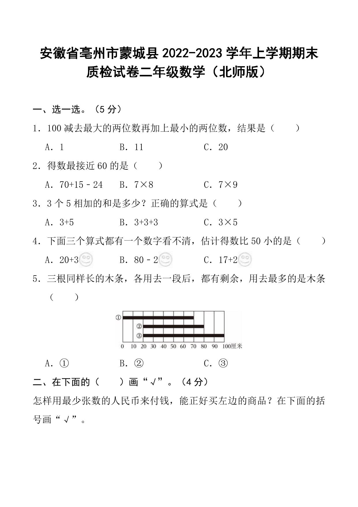 安徽省亳州市蒙城县2022-2023学年二年级上学期期末质检试卷二年级数学(北师版)