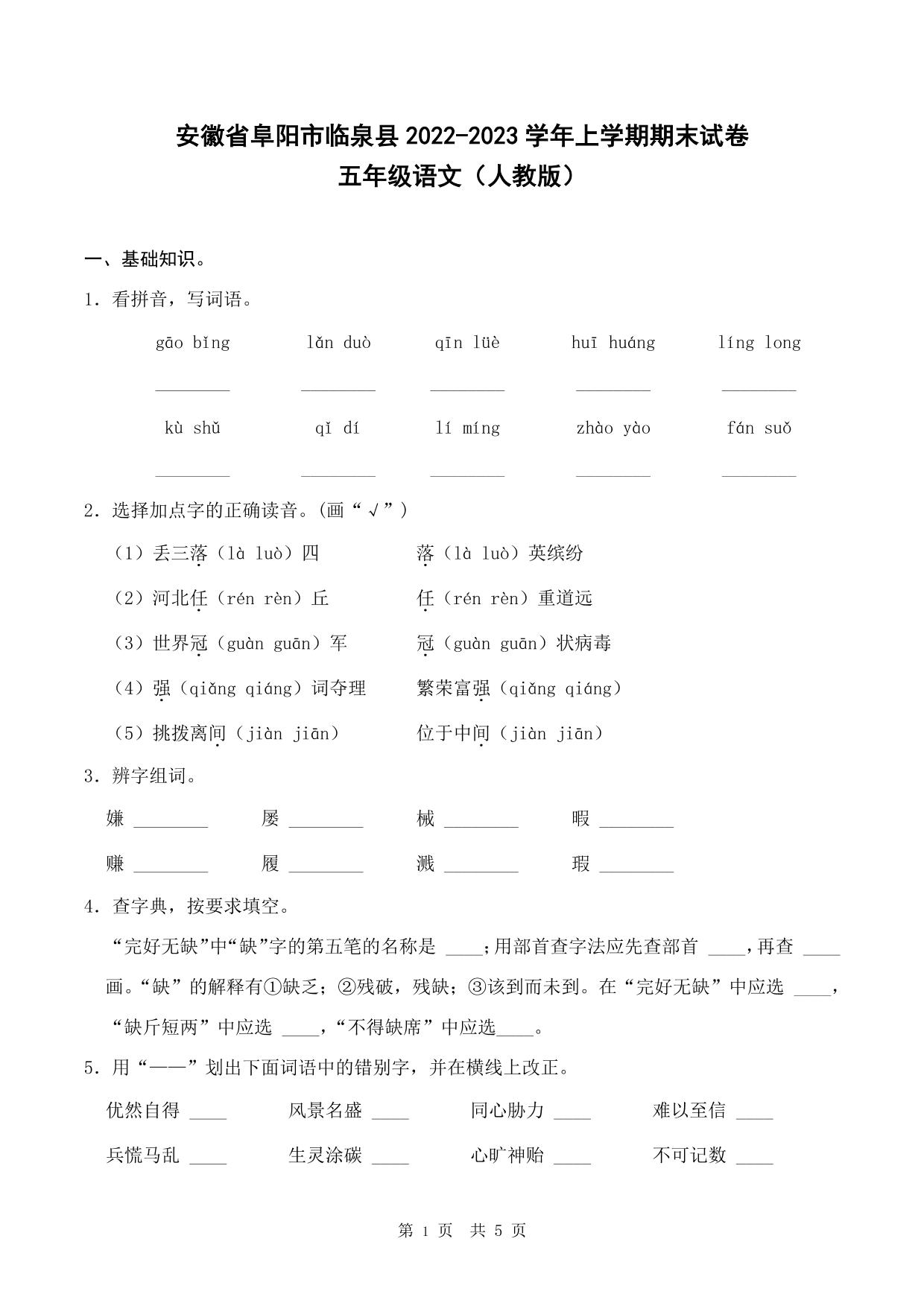 安徽省阜阳市临泉县2022-2023学年上学期期末试卷五年级语文(人教版)