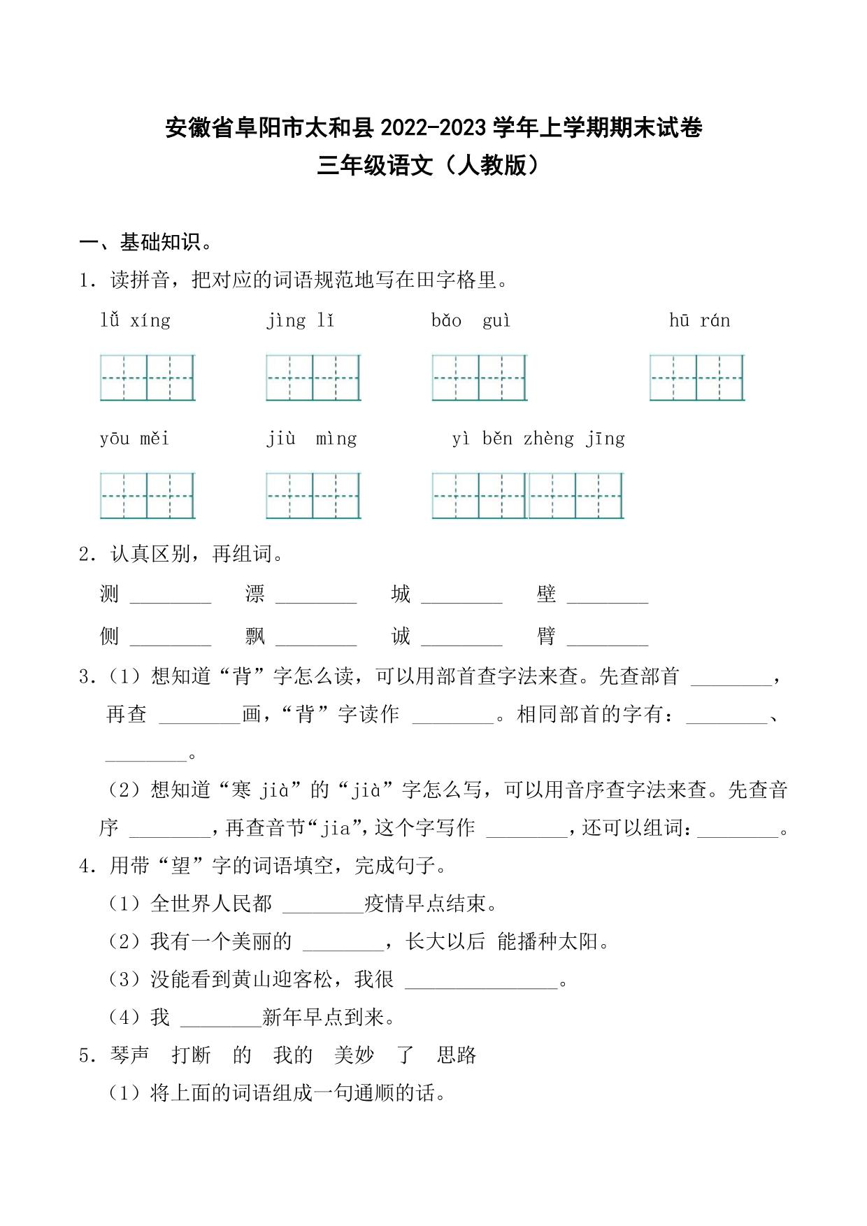 安徽省阜阳市太和县2022-2023学年上学期期末试卷三年级语文(人教版)