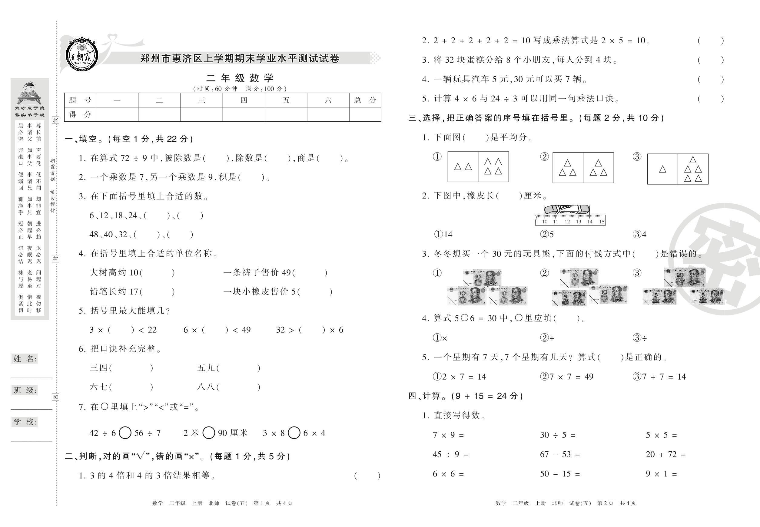 2016-2017学年第一学期郑州市二年级数学试卷(北师版)【5】
