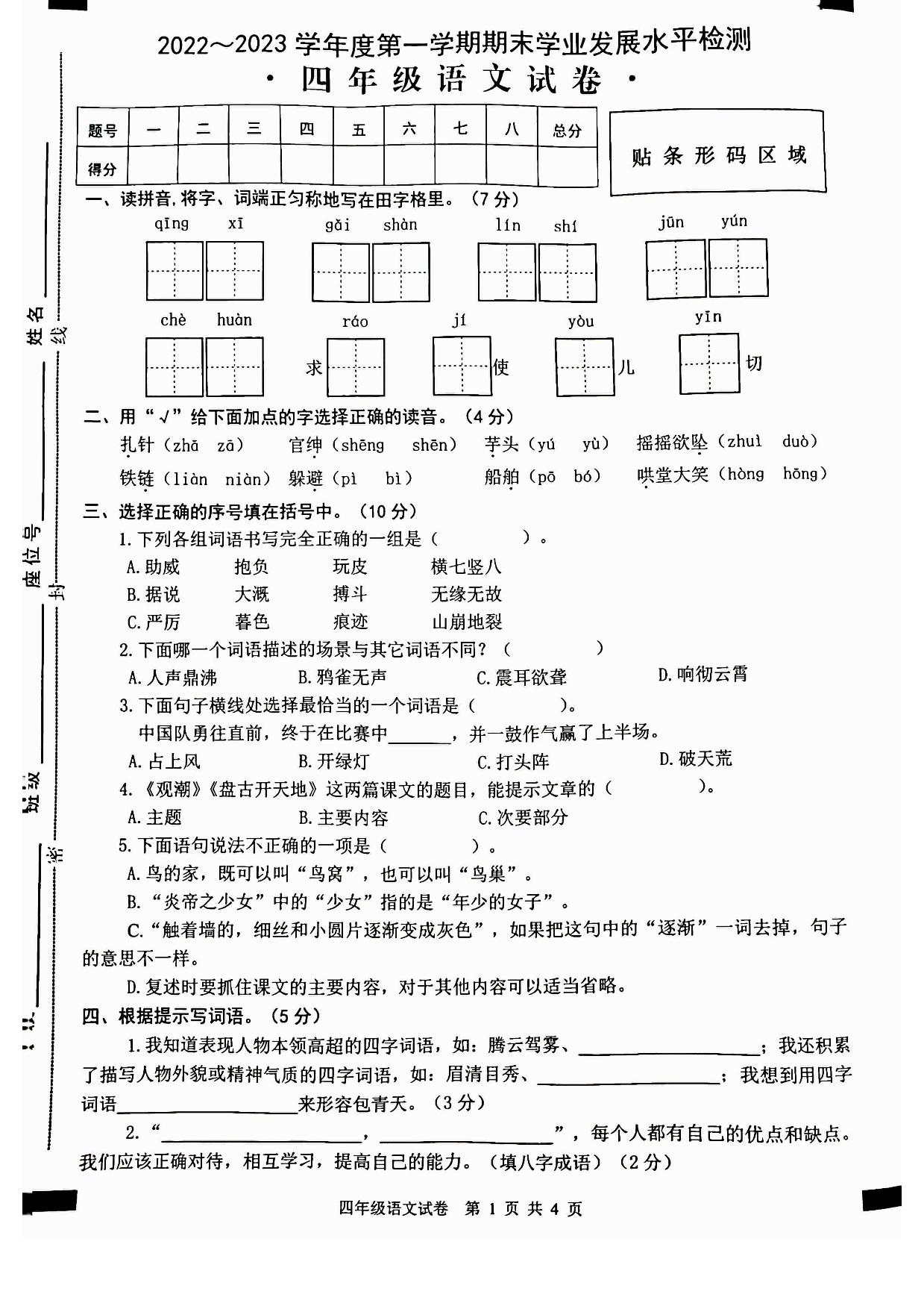 安徽省芜湖市无为市2022-2023学年度第一学期期末学业发展水平检测四年级语文(人教版)