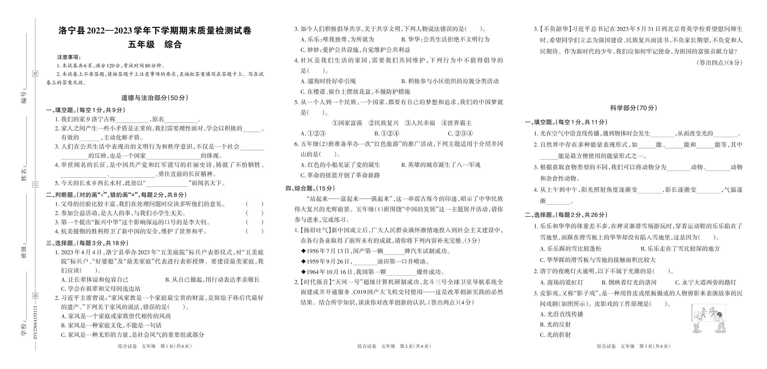 河南省洛阳市洛宁县2022—2023学年下学期期末质量检测综合试卷五年级科学(大象版)