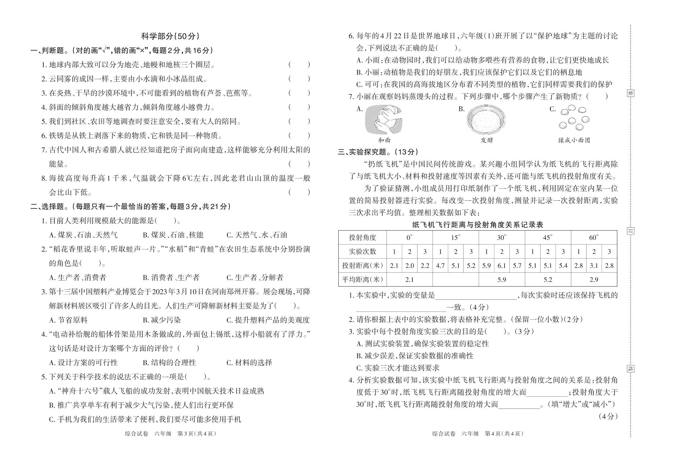 河南省洛阳市栾川县2022—2023学年下学期期末质量检测试卷(三)六年级科学(大象版)