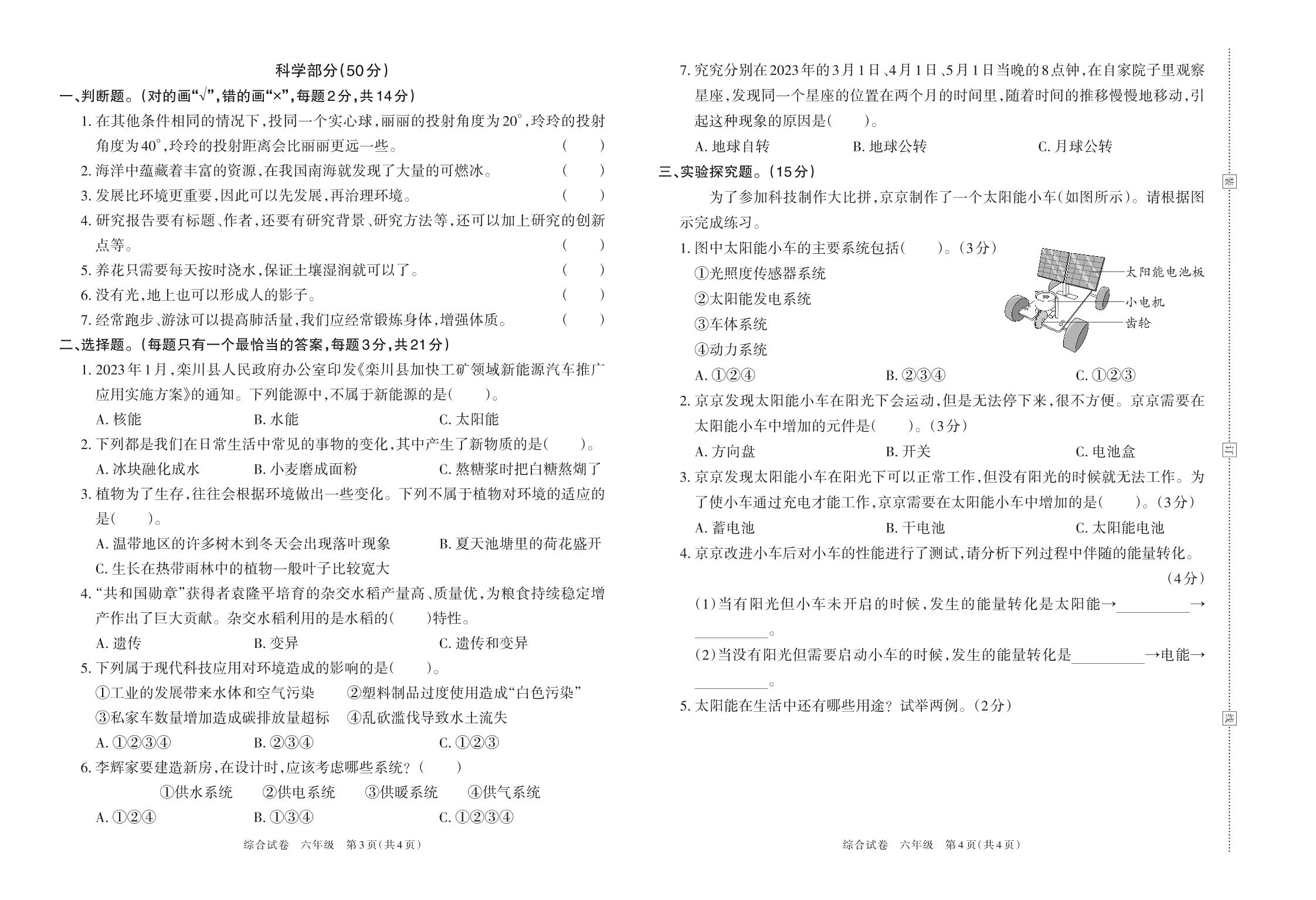 河南省洛阳市栾川县2022—2023学年下学期期末质量检测试卷(四)六年级科学(大象版)