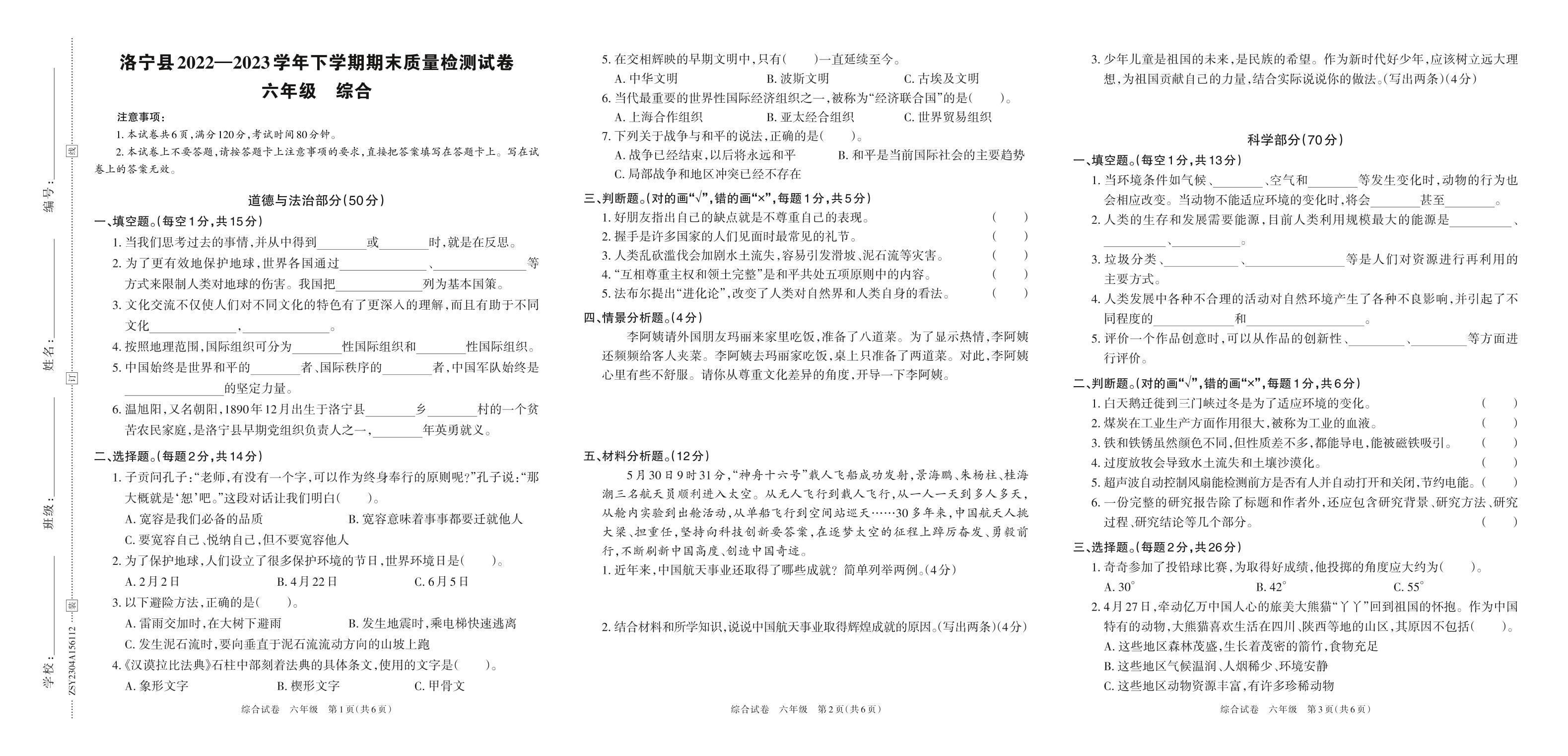 河南省洛阳市洛宁县2022—2023学年下学期期末质量检测综合试卷六年级道德与法治(人教版)
