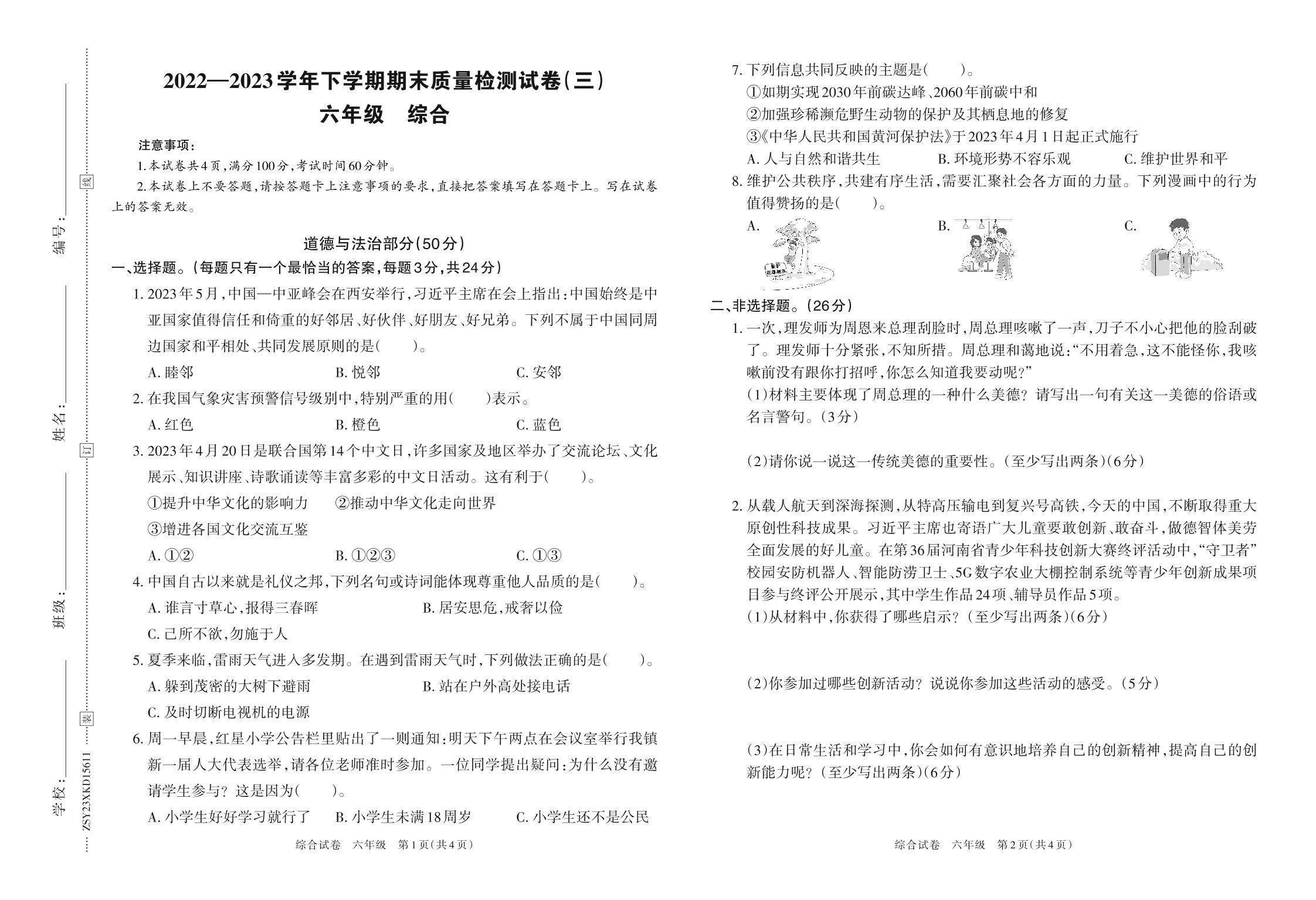 河南省洛阳市栾川县2022—2023学年下学期期末质量检测试卷(三)六年级道德与法治(人教版)