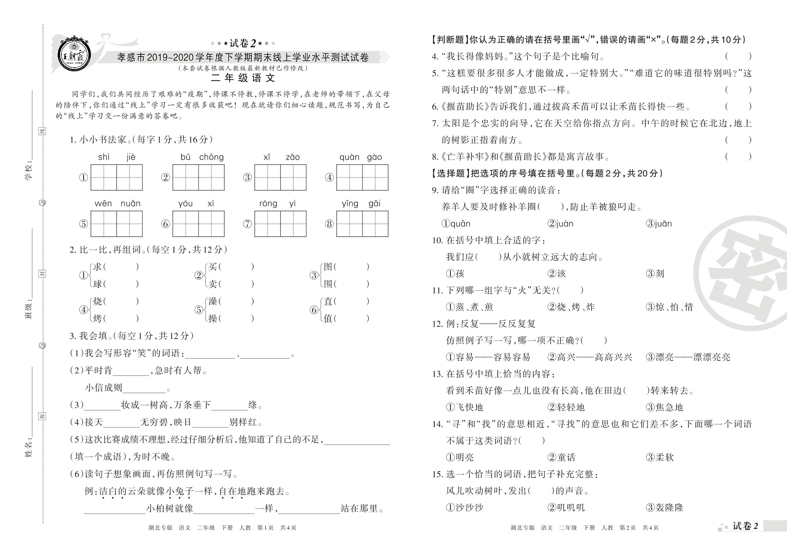 2019-2020学年第二学期孝感市二年级语文试卷(人教版)【2】