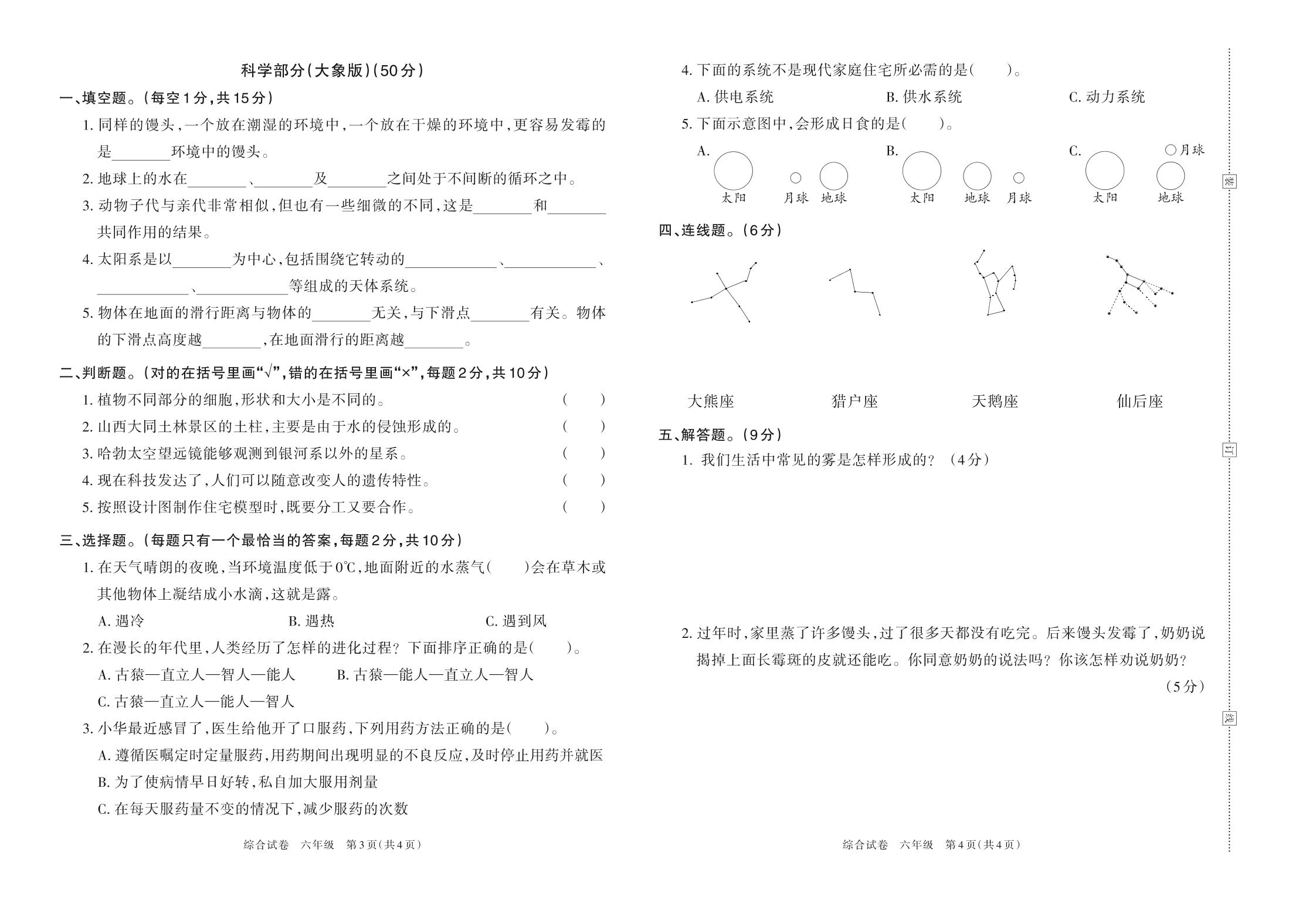 河南省安阳市安阳县2023春开学学业质量评估试卷六年级科学(大象版)