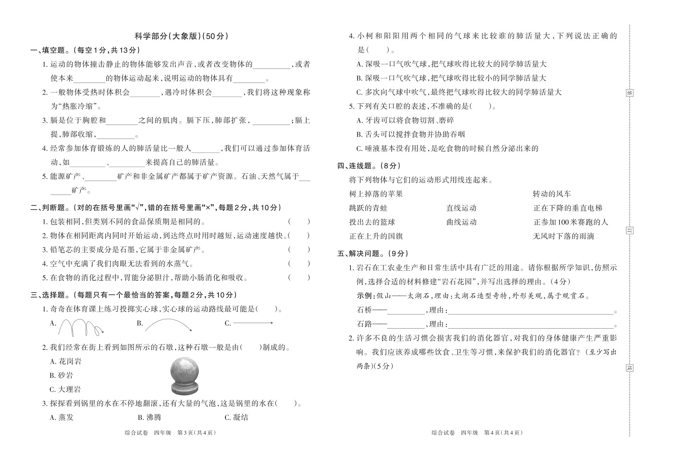 河南省安阳市安阳县2023春开学学业质量评估试卷四年级科学(大象版)