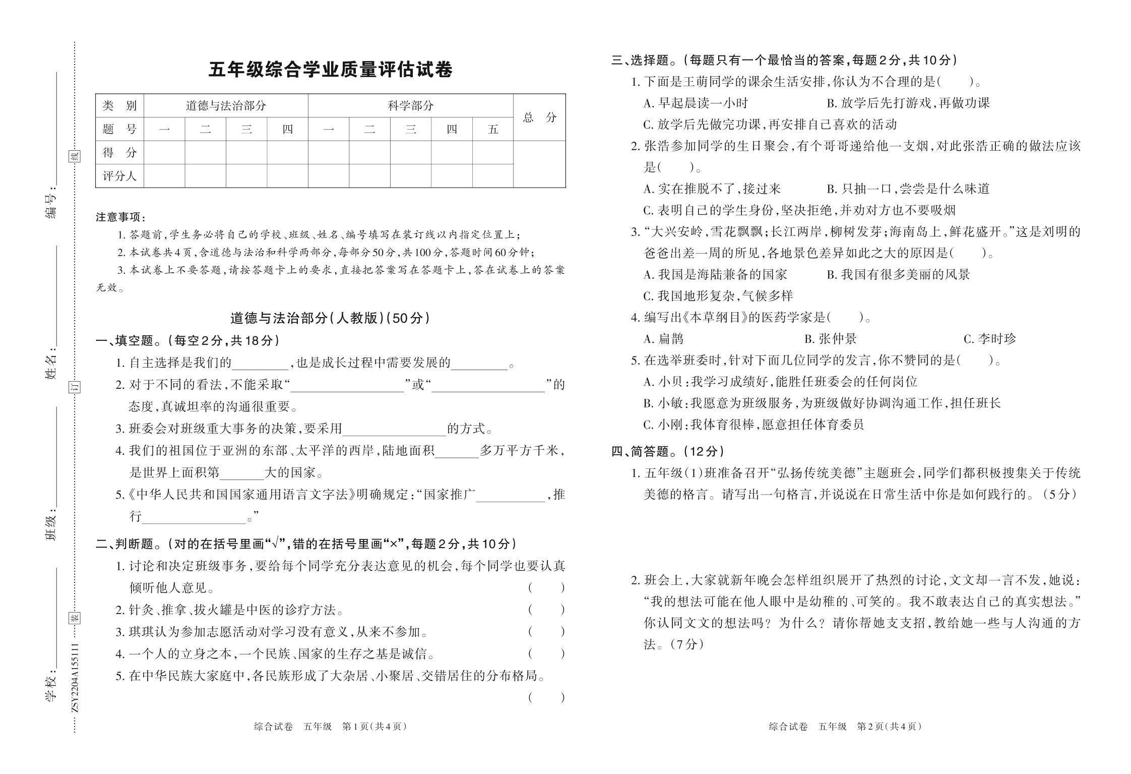 河南省安阳市安阳县2023春开学学业质量评估试卷五年级道德与法治(人教版)