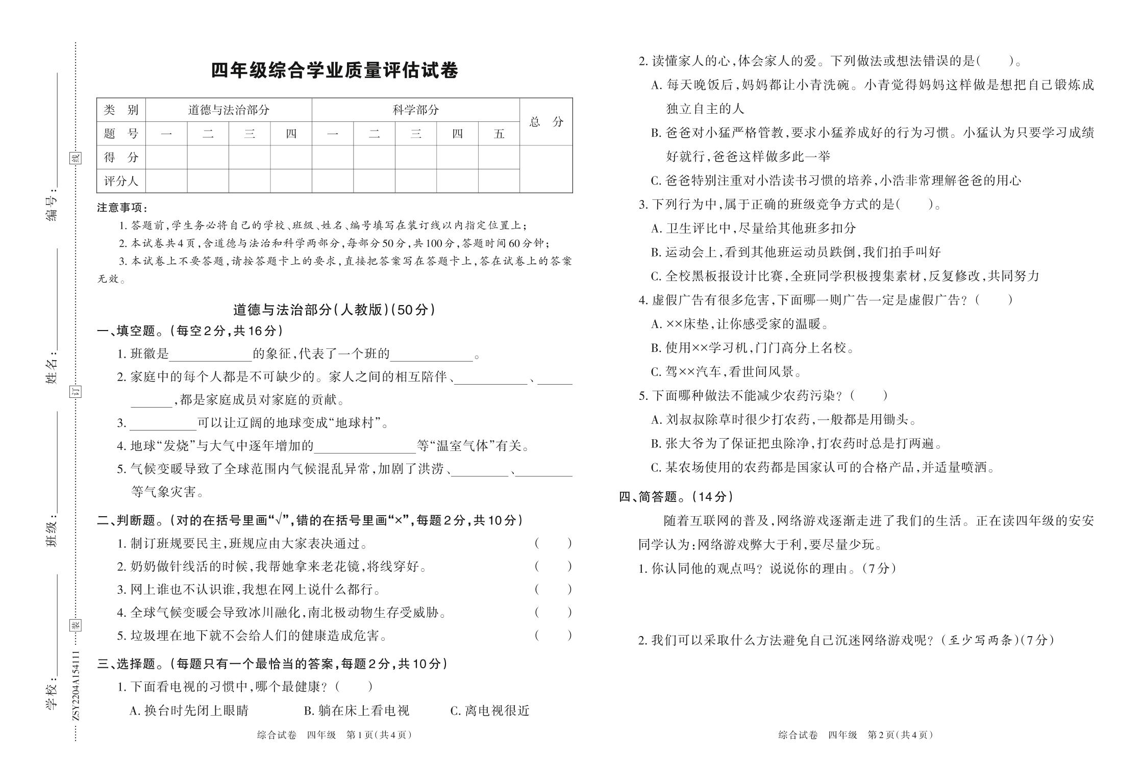 河南省安阳市安阳县2023春开学学业质量评估试卷四年级道德与法治(人教版)