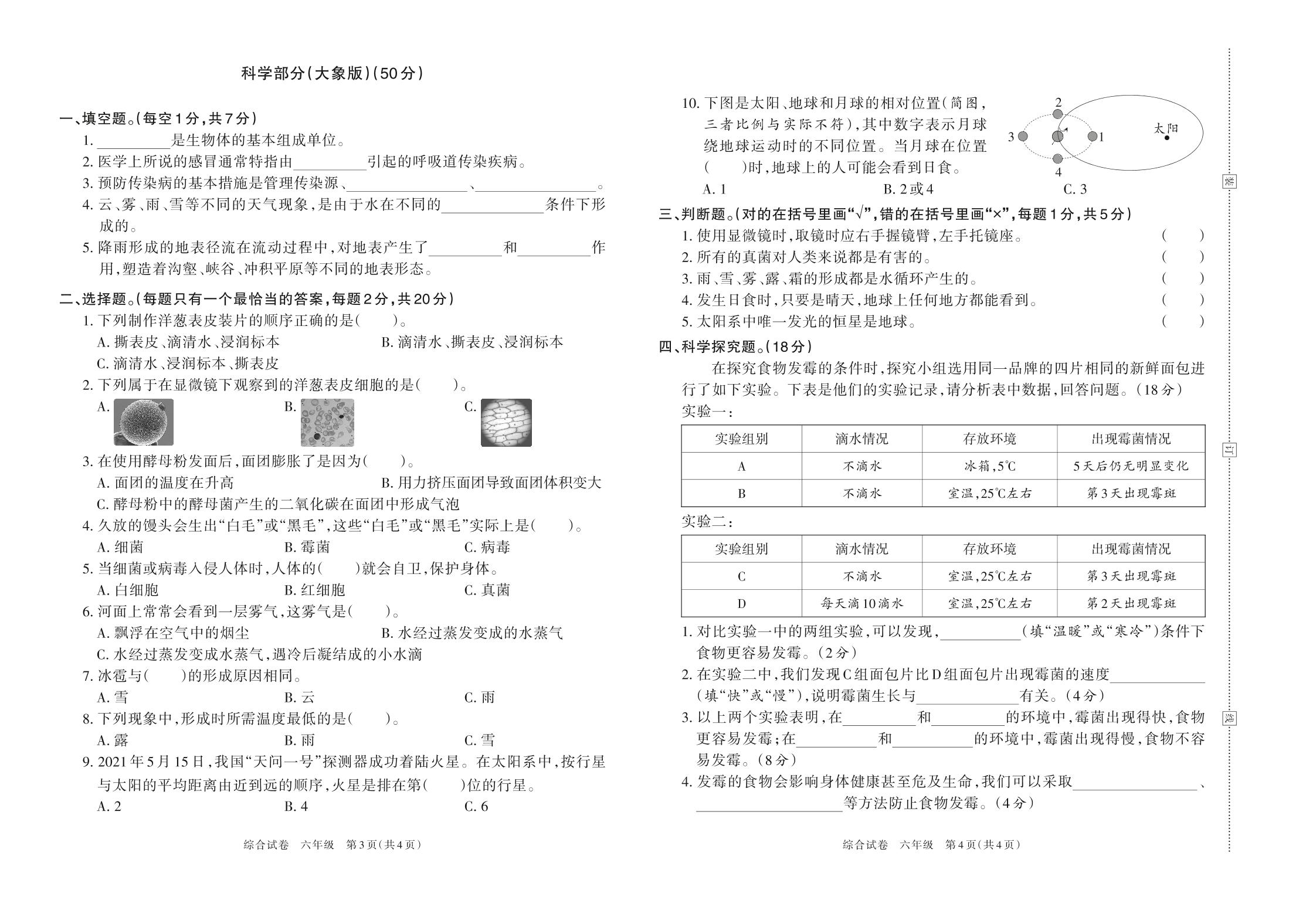 河南省安阳市汤阴县任固中心小学2022—2023学年上学期期中学情诊断六年级科学(大象版)
