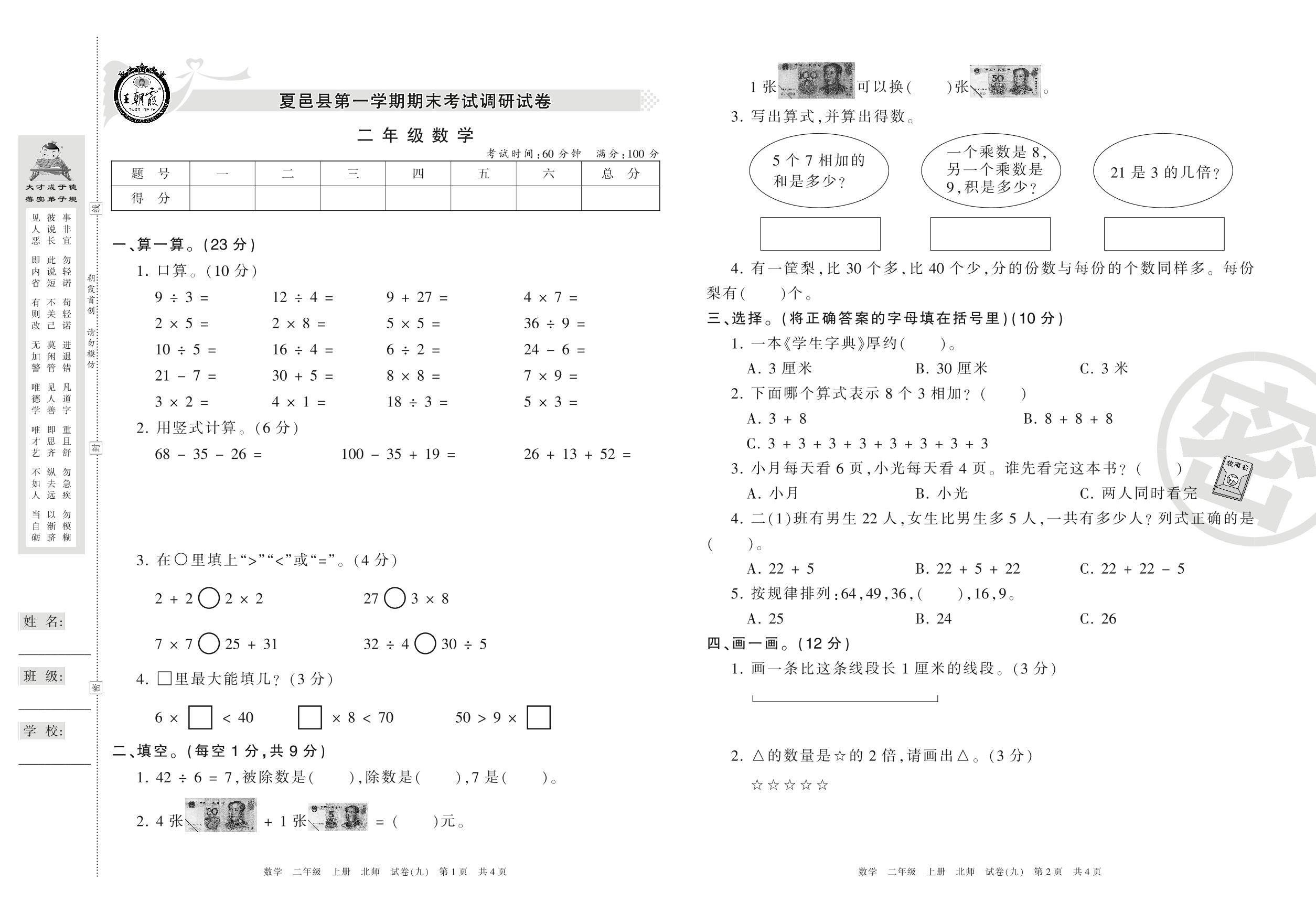 2016-2017学年第一学期商丘市夏邑县二年级数学试卷(北师版)【9】