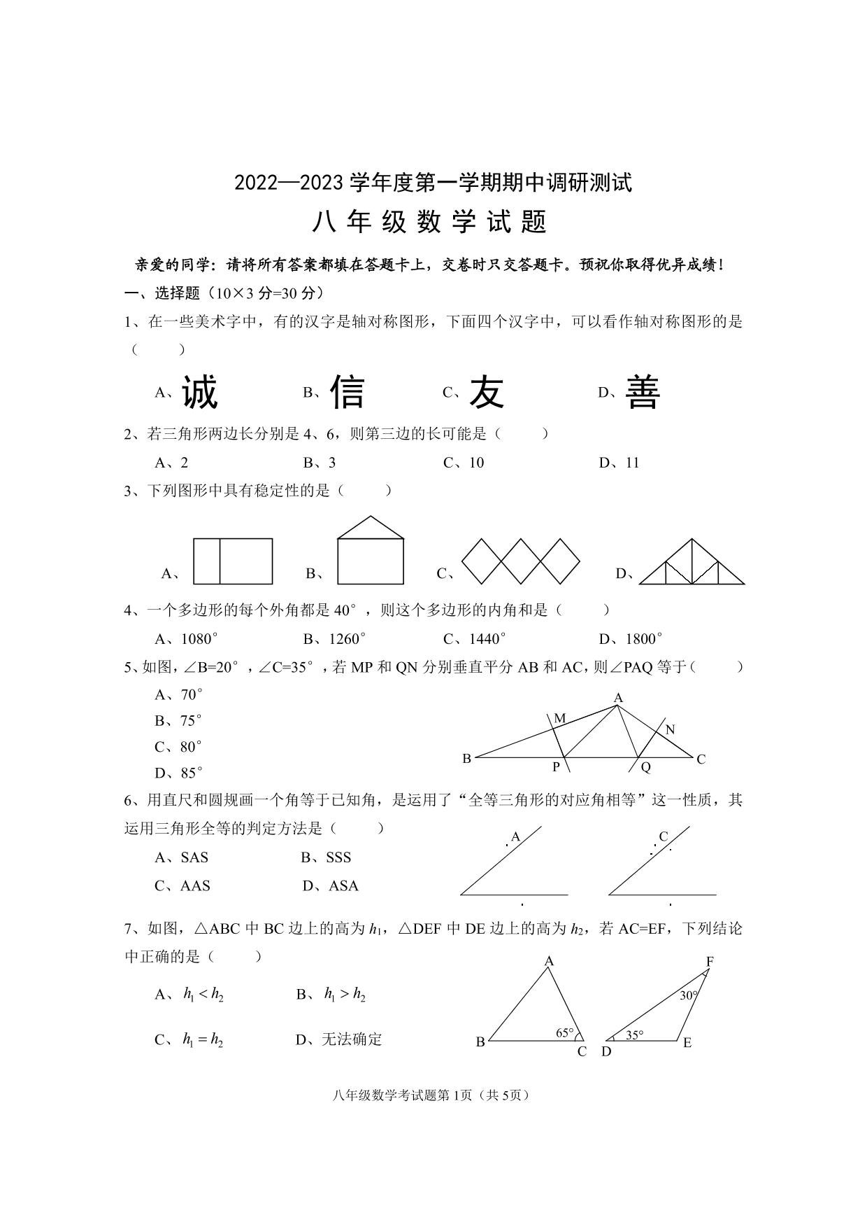湖北省武汉市江夏、蔡甸区2022-2023学年度第一学期期中调研测试试题八年级数学(人教版)