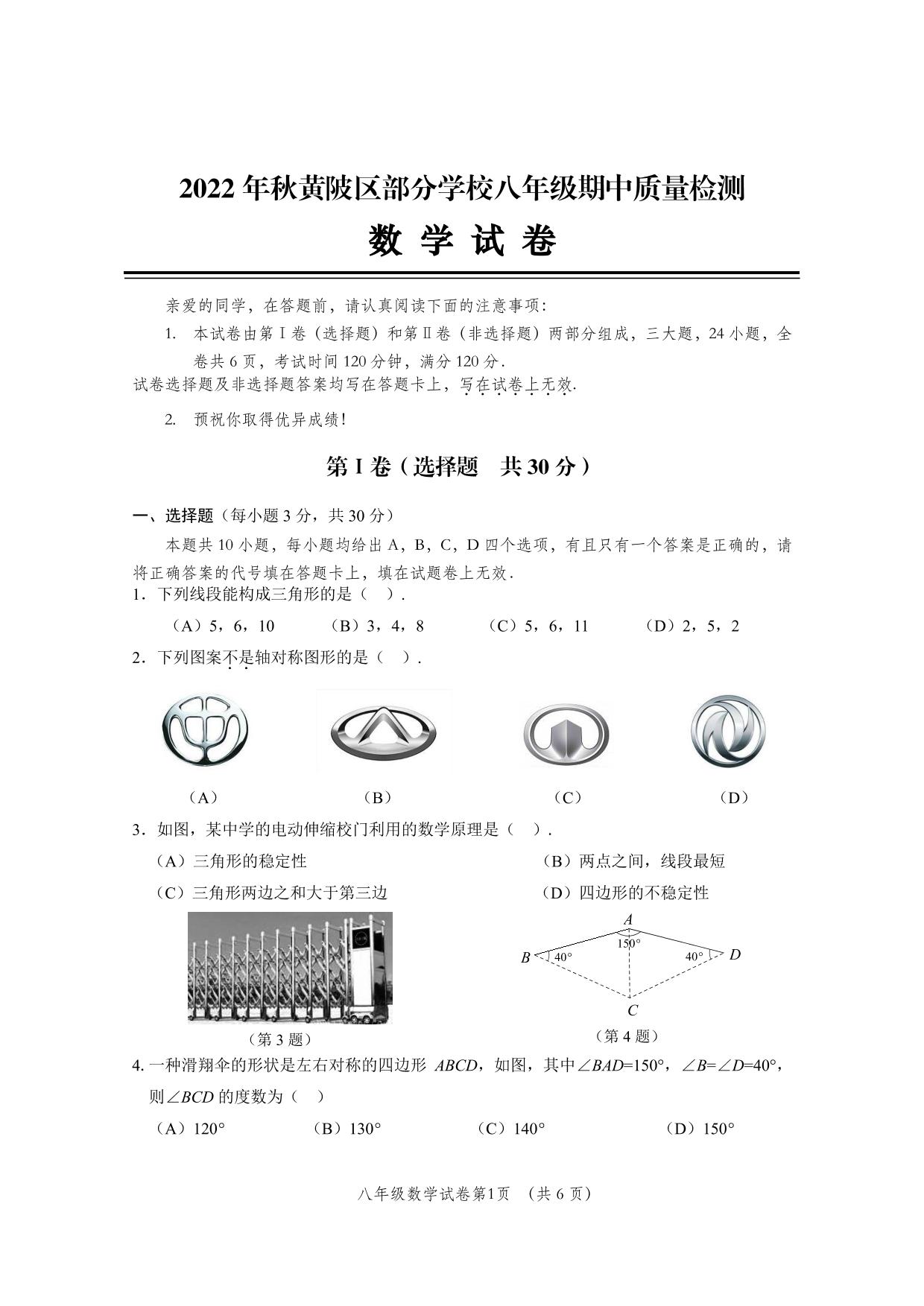 湖北省武汉市黄陂区2022-2023学年度第一学期期中质量检测试卷八年级数学(人教版)