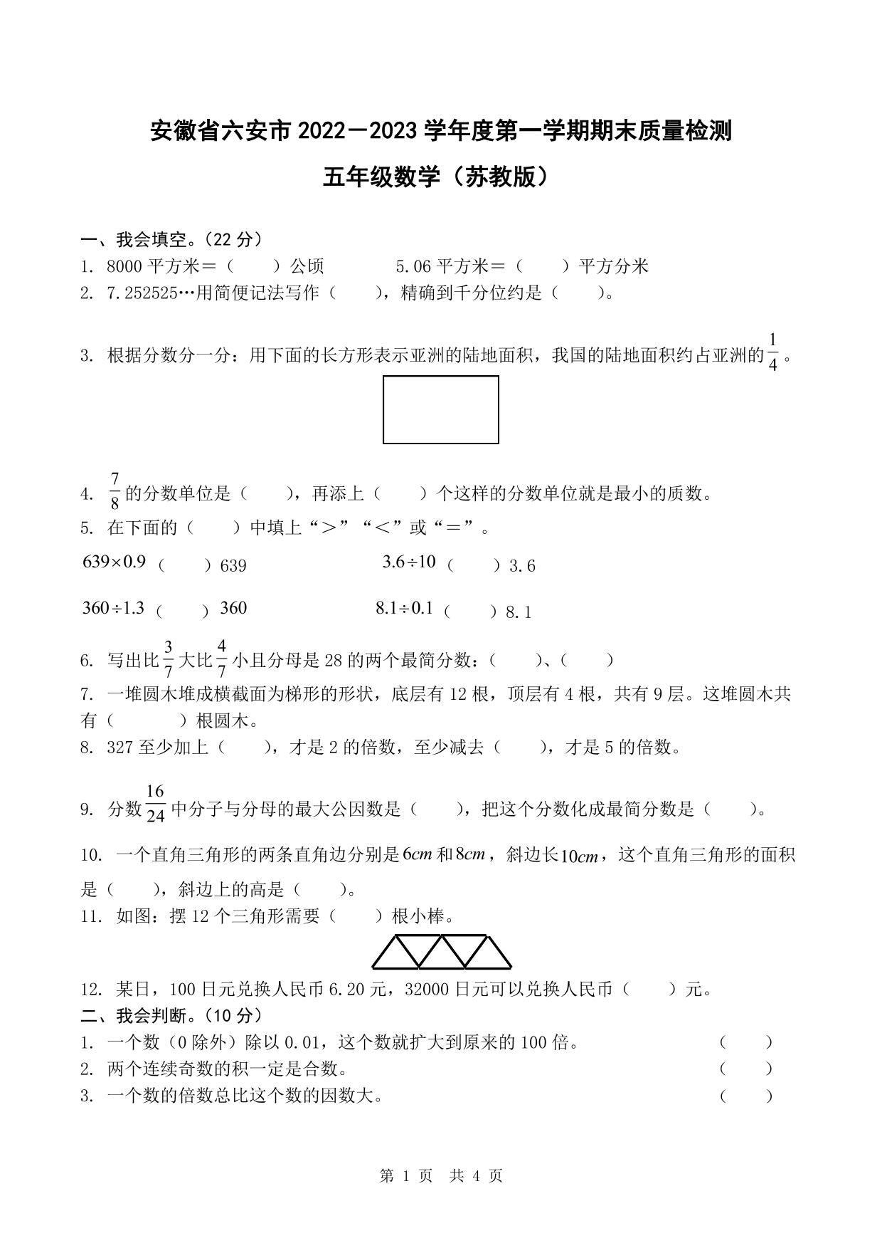 安徽省六安市2022-2023学年度第一学期期末质量检测五年级数学(苏教版)