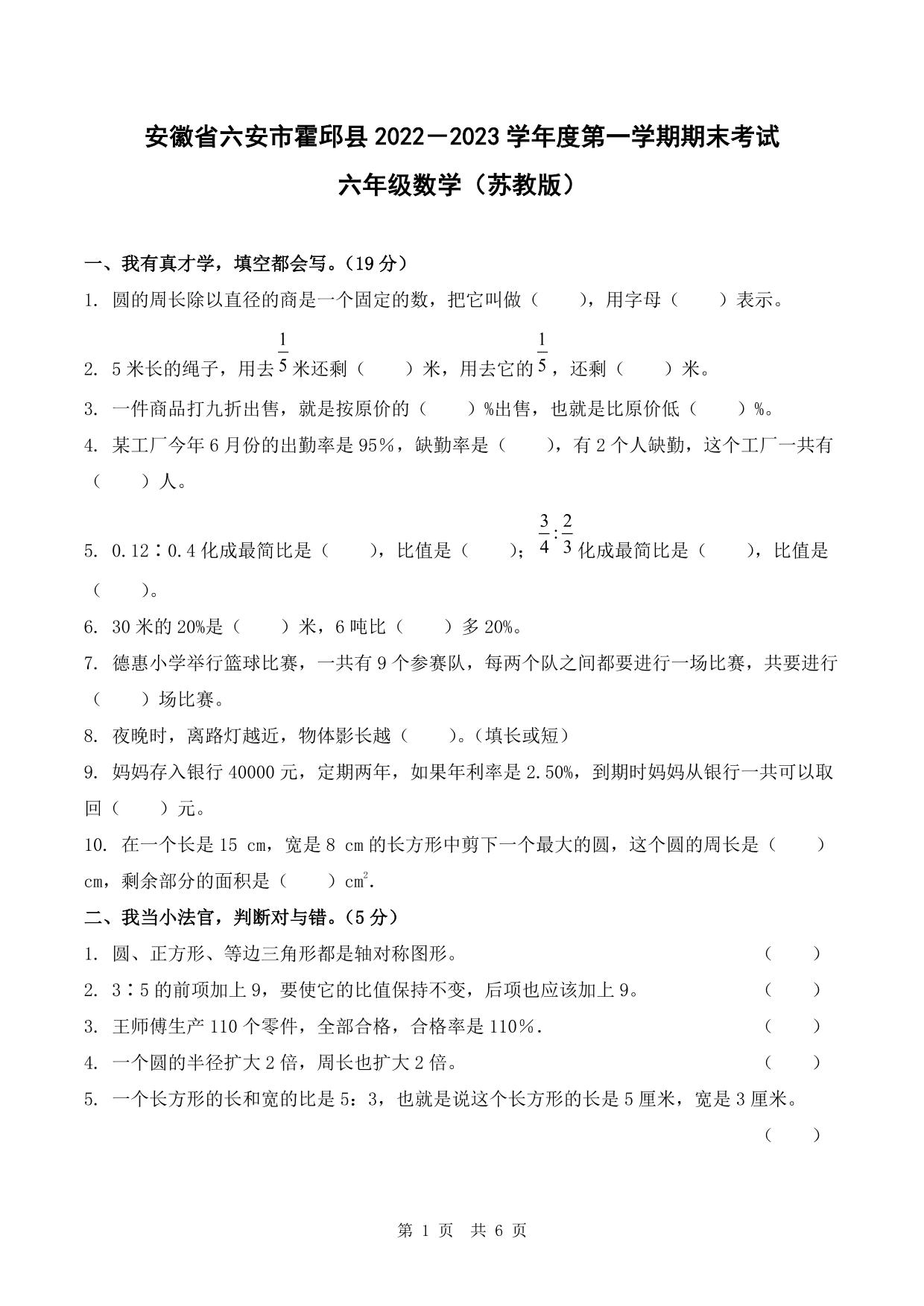 安徽省六安市霍邱县2022-2023学年度第一学期期末考试六年级数学(苏教版)