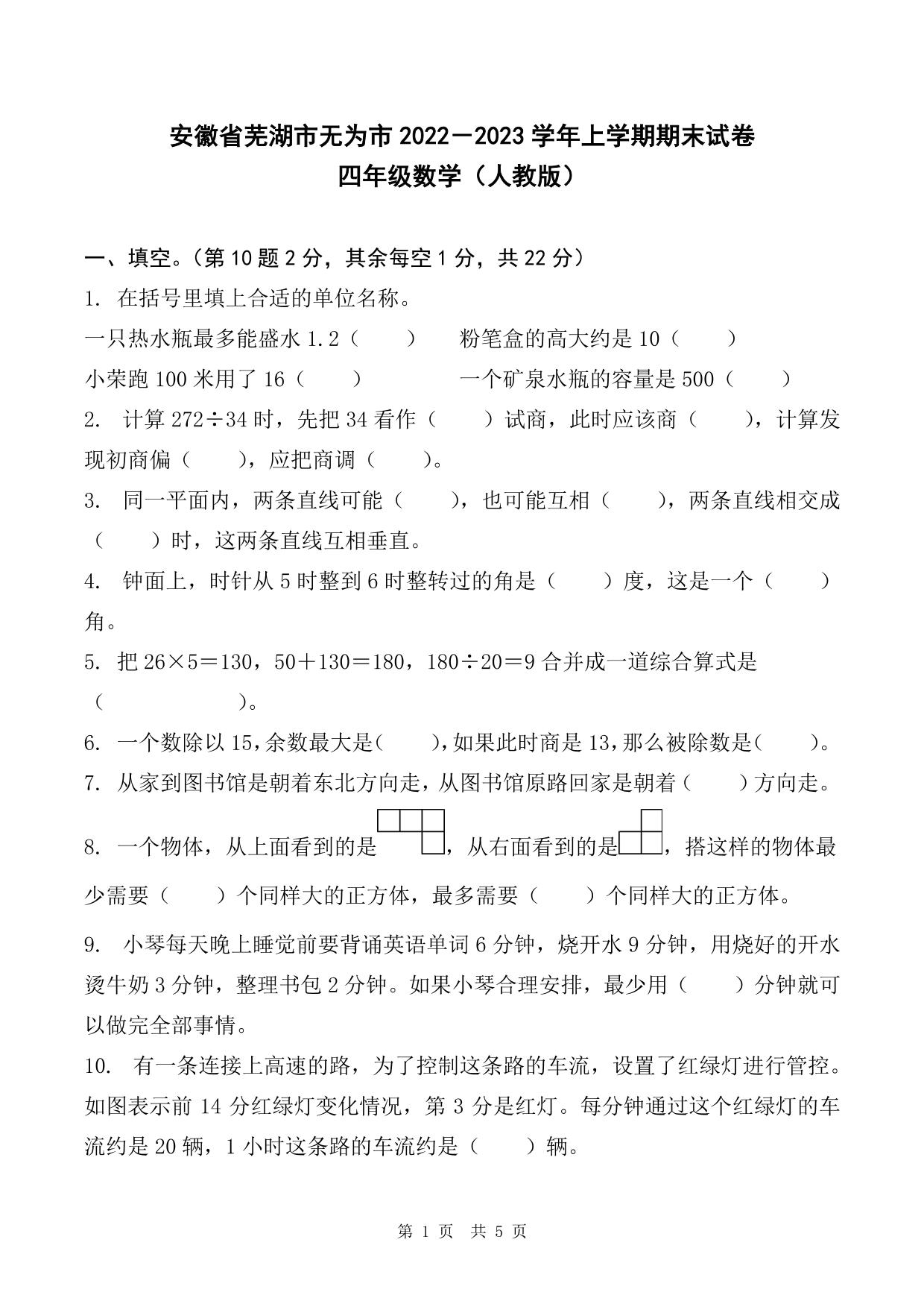 安徽省芜湖市无为市2022-2023学年上学期期末试卷四年级数学(人教版)