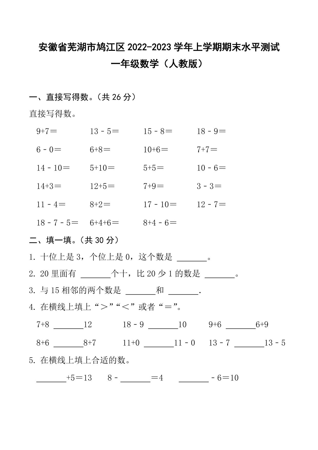 安徽省芜湖市鸠江区2022-2023学年上学期期末水平测试一年级数学(人教版)