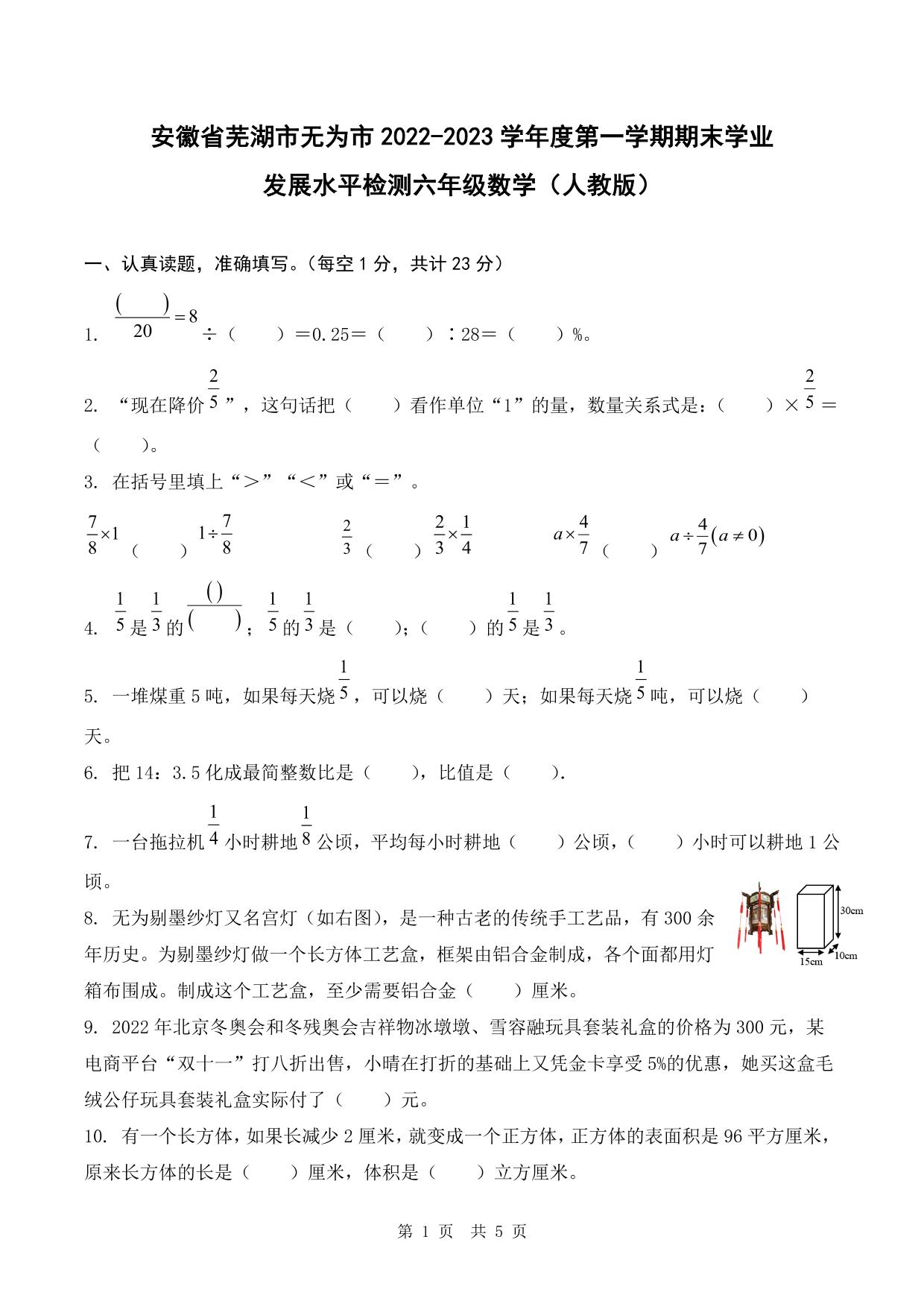 安徽省芜湖市无为市2022-2023学年度第一学期期末学业发展水平检测六年级数学(人教版)
